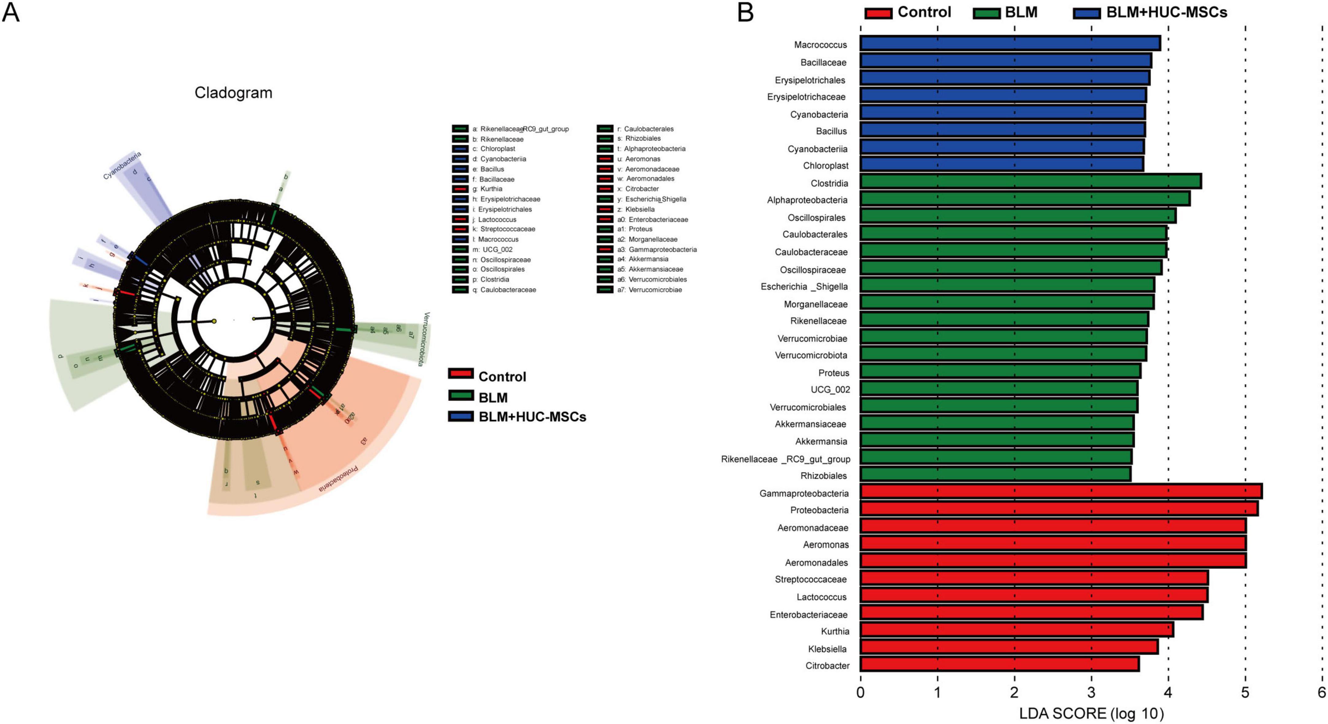 To gain better insight into the impact of HUC-MSCs intervention on the lung microbiota of mice, we conducted linear discriminant analysis size effect (LefSe). As shown in Figures 4A, B, biomarkers with linear discriminant analysis (LDA) values > 3 and p < 0.05 were screened. γ-Protobacteria, Proteobacteria, Aeromonadaceae, Aeromonas, Aeromonadales and Streptococcaceae were enriched in the Control group. Clostridia, α-Proteobacteria, Oscillospirales, Caulobacteraceae, Oscillospiraceae and Caulobacterales were enriched in the BLM group. The BLM + HUC-MSCs group presented increased relative abundances of Macrococcus, Bacillaceae, Erysipelotrichales, Cyanobacteria, Bacilli, and Erysipelotrichaceae.