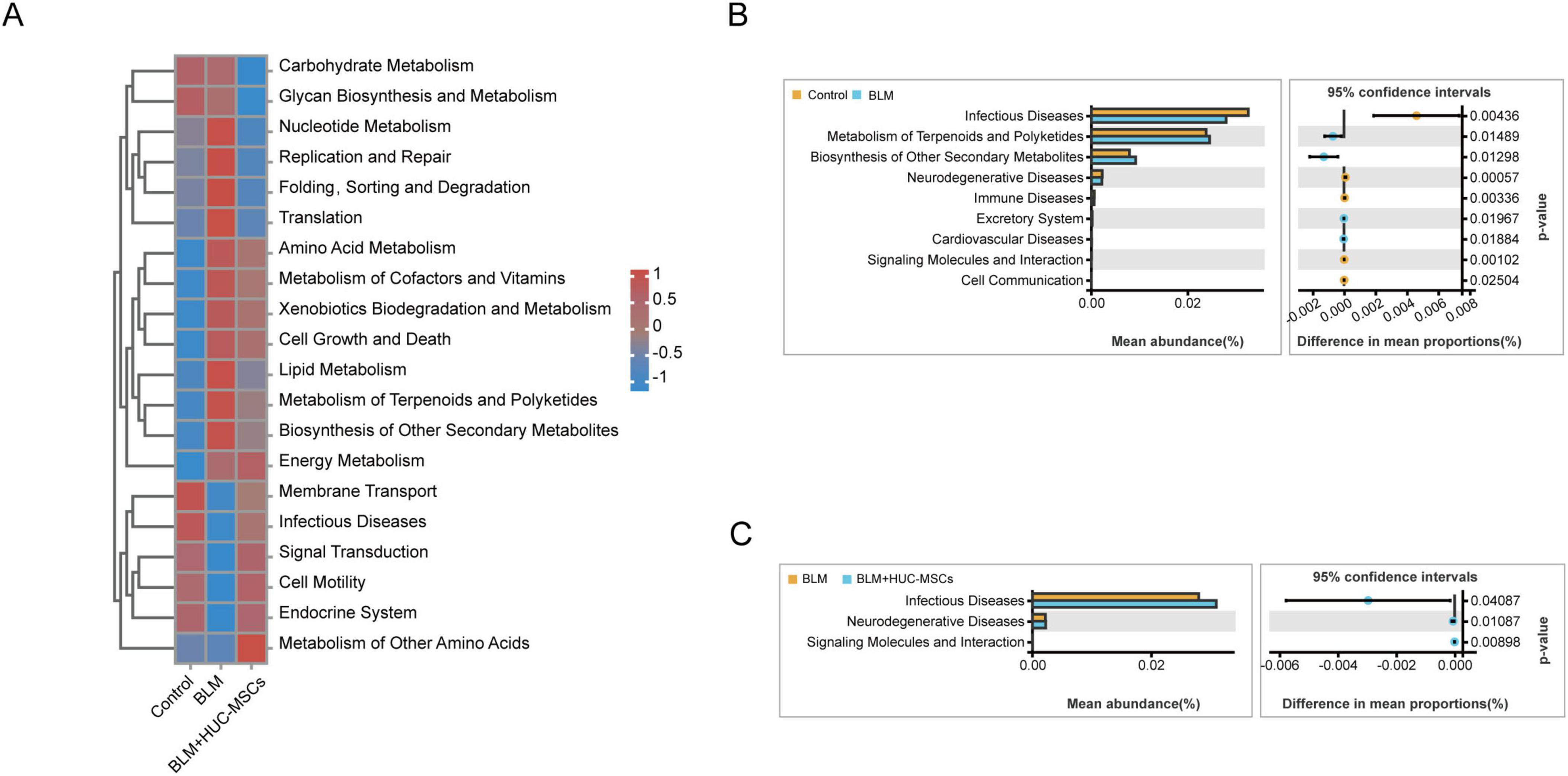 Figure 5. Analysis to predict the metabolic function of the lung microbiota on the basis of Tax4Fun predictions. (A) Heatmap of the level 2 functional pathways of the lung microbiota. (B) Comparison of microbial function prediction between the Control group and the BLM group. (C) Comparison of microbial function prediction between the BLM group and the BLM+HUC-MSCs group.