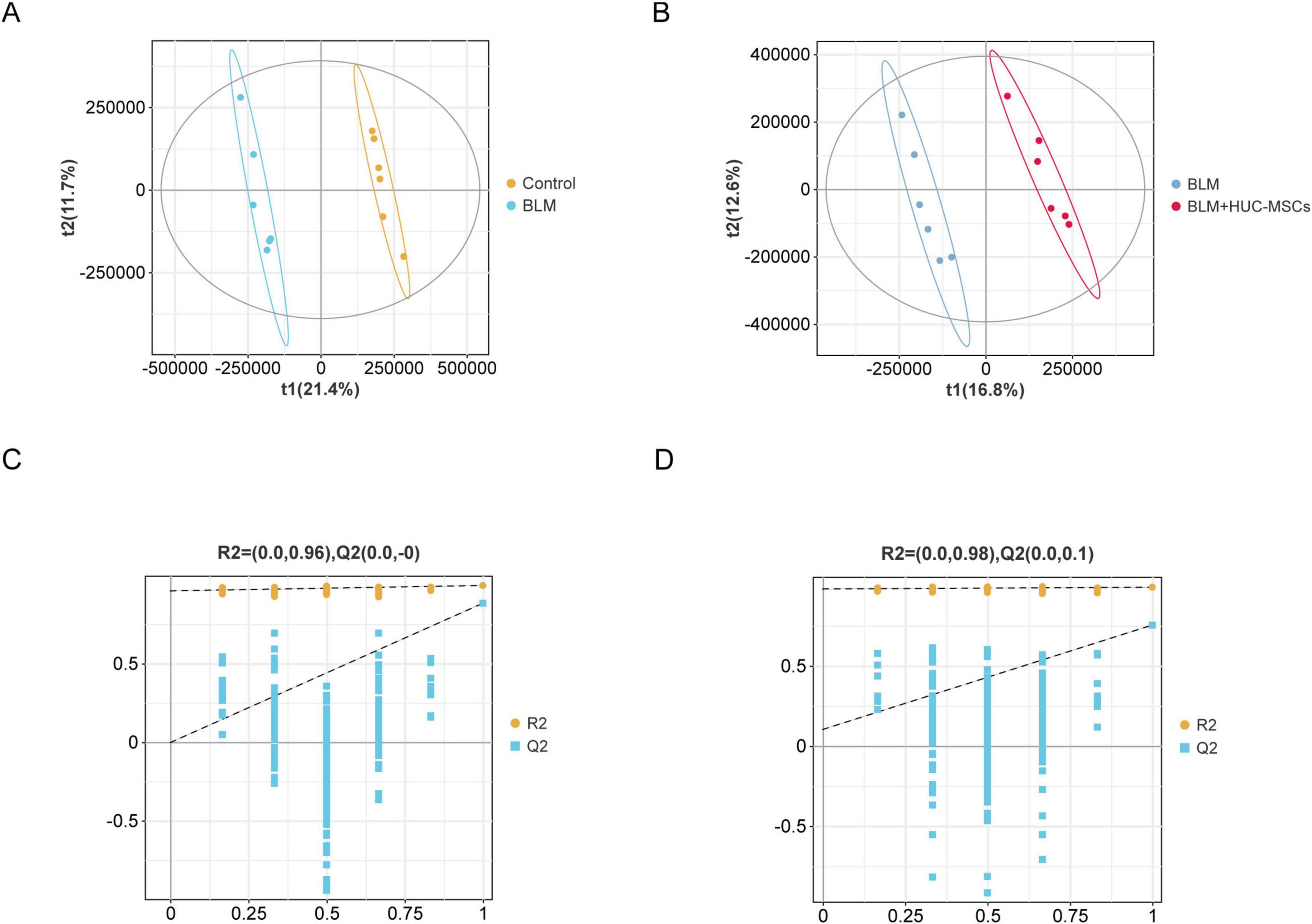 Figure 6. Score plots for the PLS-DA model and its corresponding permutation test plots. (A) PLS–DA diagrams of the Control and BLM groups. (B) PLS–DA diagrams of the BLM and BLM + HUC-MSCs groups. (C–D) Corresponding model validation plots.