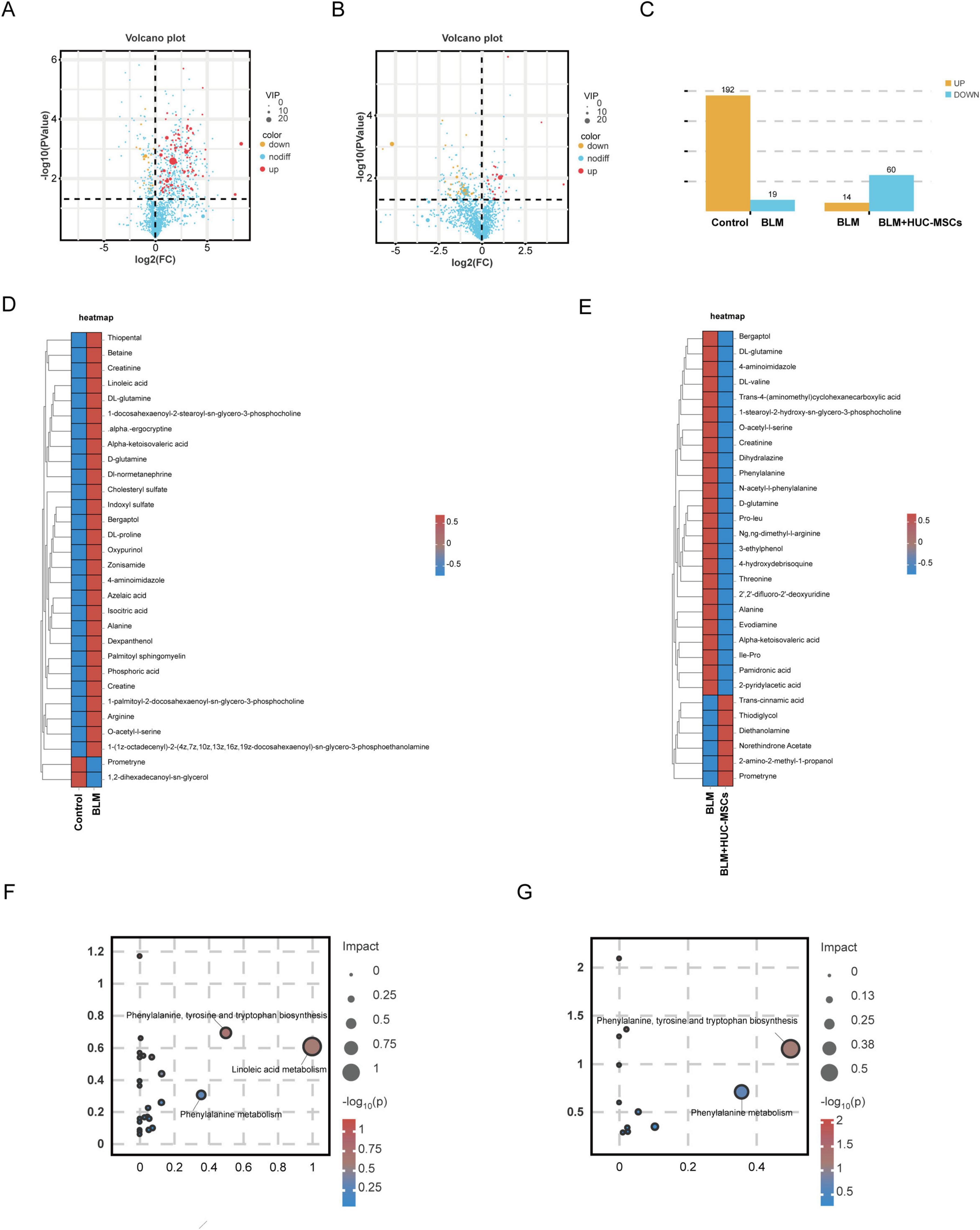 Figure 7. Differentially abundant metabolite identification and enrichment analysis based on the KEGG database. (A) Volcano plots of differentially abundant metabolites between the Control and BLM groups. (B) Volcanic map of differentially abundant metabolites between the BLM and BLM + HUC-MSCs groups. (C) Histogram of changes in differentially abundant metabolites. (D,E) Heatmap of the clustering of differentially abundant metabolites. The colors from red to blue in the heatmap indicate the abundance of metabolites in each group of samples from high to low. (F) KEGG pathway analysis of differentially abundant metabolites between the Control and BLM groups. (G) KEGG pathway analysis of differentially abundant metabolites between the BLM and BLM + HUC-MSCs groups.