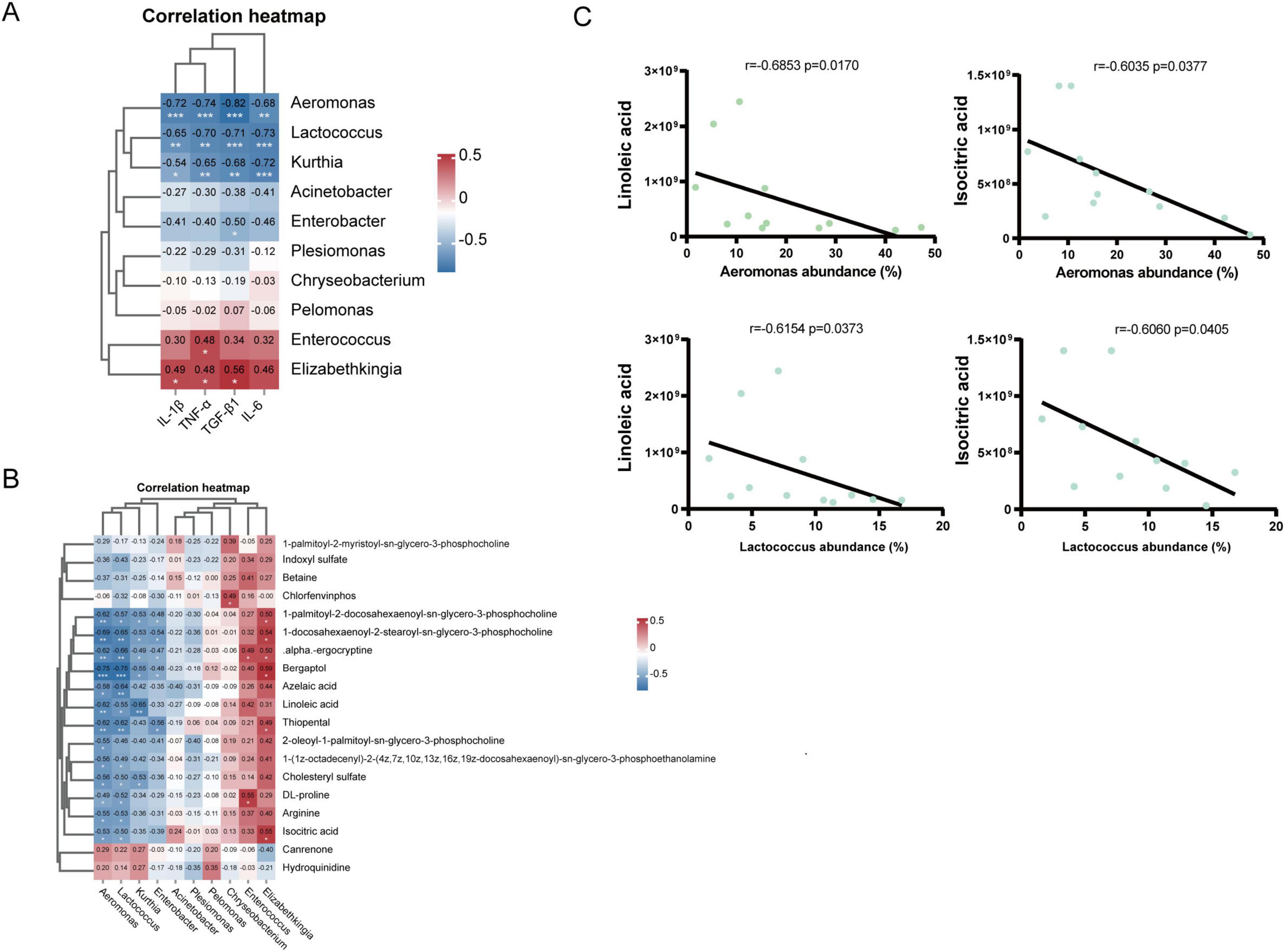Figure 8. Correlations among the lung microbiota and cytokines and metabolites. (A) Spearman analysis of cytokines and 10 key differentially abundant genes in the lung microbiota at the genus level. (B) Spearman analysis of 20 significantly different metabolites and 10 key differentially abundant metabolites in the lung microbiota at the genus level. (C) Spearman’s rank correlation between the relative abundances of Aeromonas, Lactococcus and several metabolites (*p < 0.05, **p < 0.01, ***p < 0.001, ****p < 0.0001).