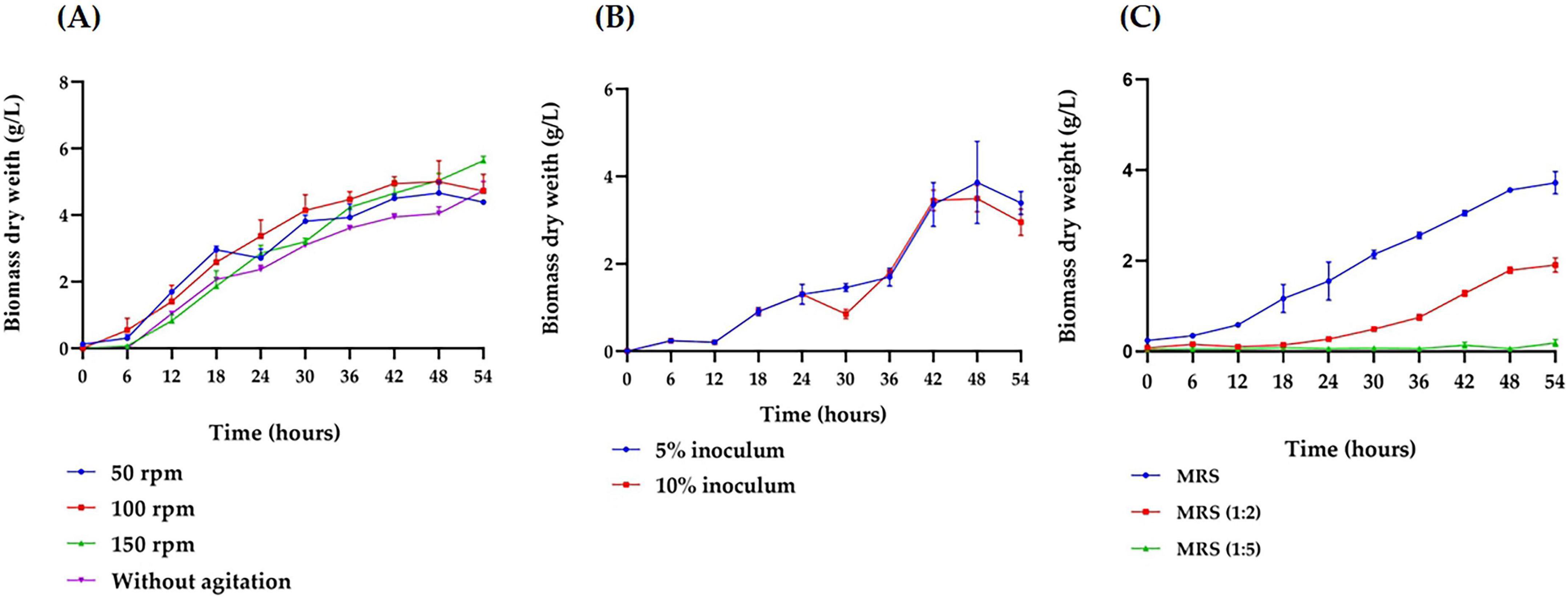 To improve biomass production, agitation speed, inoculum concentration, and medium strength were evaluated. Microcultures (5 and 25 mL) were incubated at 37 °C under anaerobic conditions with different agitation speeds (0, 50, 100, and 150 rpm), two inoculum concentrations (5% and 10% v/v), and MRS dilutions (undiluted MRS medium, 1:2, and 1:5). Biomass was quantified every 6 h by dry weight as described by Pedroza-Rodríguez et al. (2007). All experiments were performed in triplicate in three independent assays (Pedroza-Rodríguez et al., 2007). The calibration curve correlating absorbance with biomass dry weight (g/L) can be seen in the (Supplementary Figure 1).