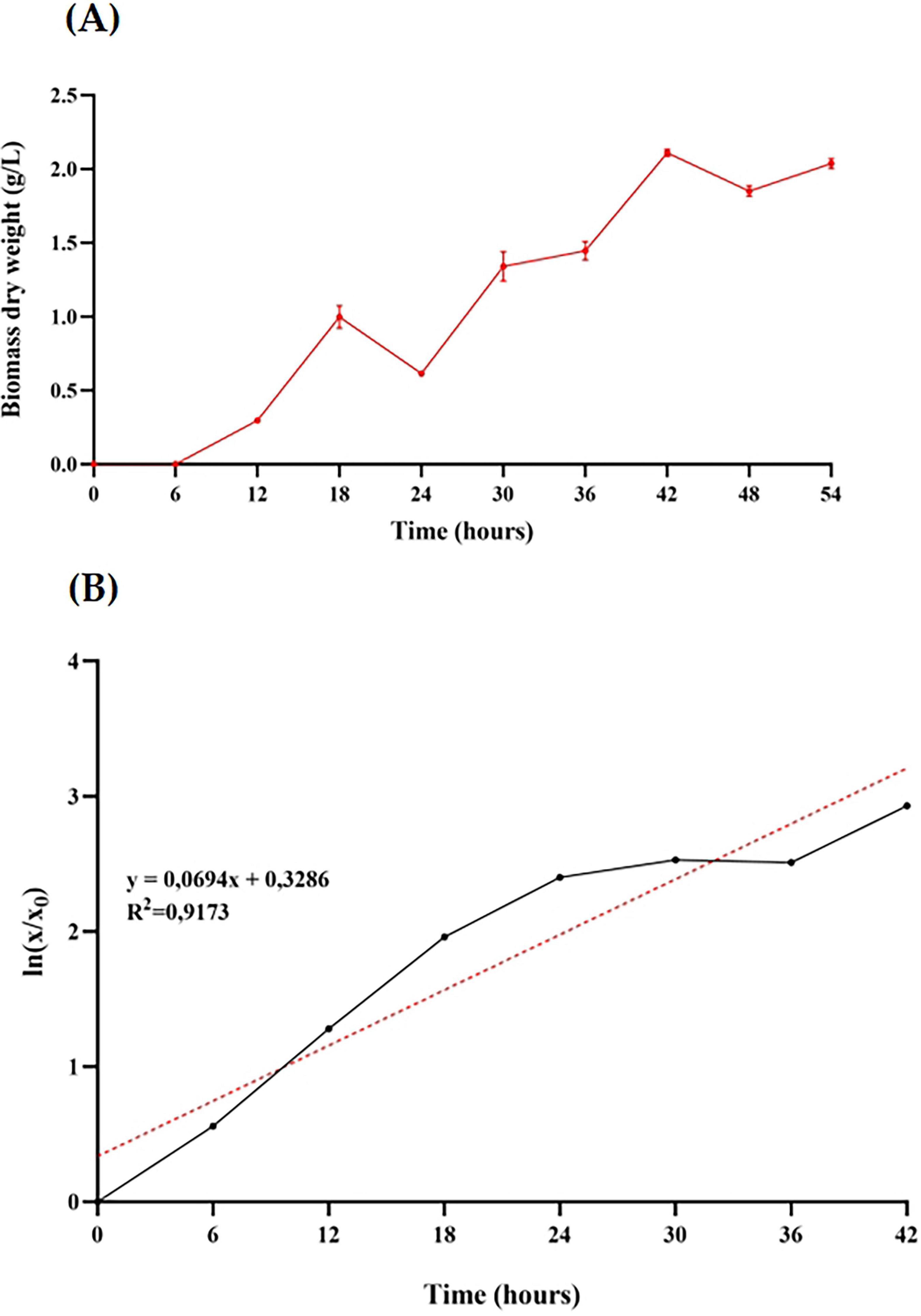 Figure 2. Growth characterization of Bifidobacterium adolescentis in a lab-scale anaerobic bioreactor. (A) Biomass dry weight (g/L) over time during batch fermentation in a 3 L bioreactor with 1.5 L MRS medium, inoculated at 5% (v/v) and maintained at 37 °C with 200 rpm agitation under anaerobic conditions for 54 h. Data points represent the mean ± standard deviation of three independent measurements. (B) First-order kinetic model fitted to the biomass growth data from panel A. The red dotted line indicates the linear regression trend line, with the corresponding equation and R2 value shown.