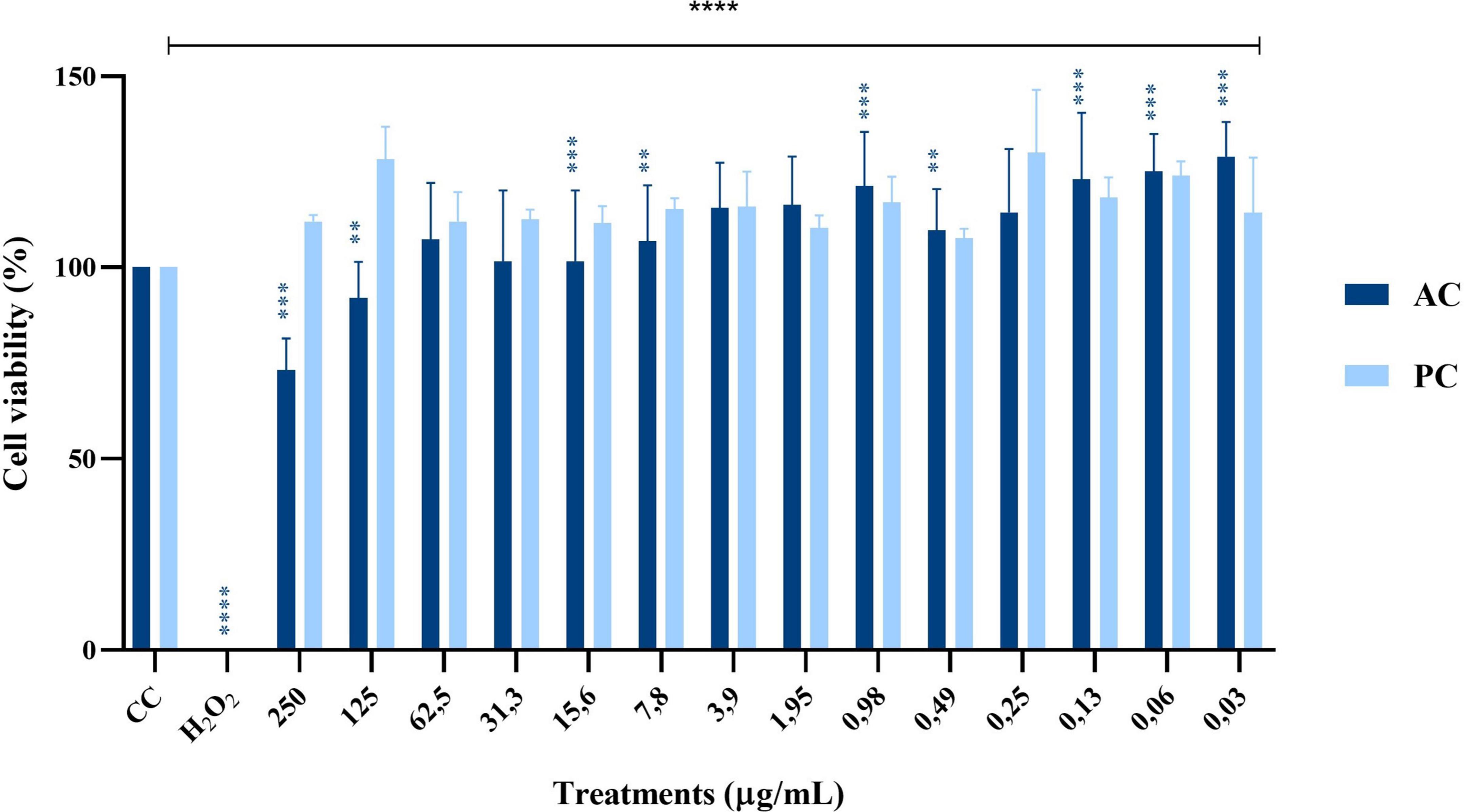 Figure 4. Effect of single doses of 14 different protein concentrations from an Abiotic Control (AC, dark blue) and a Production Control (PC, light blue) on cell viability percentage in MA104 cells, as measured by the MTT colorimetric assay (Abs 540 nm). Each bar represents the mean percentage of cell viability from three independent experiments, with error bars indicating standard deviation. Data were analyzed using an independent samples Mann–Whitney U test. Differences between the evaluated concentrations and the cell control (CC) were significant. Significance levels are indicated as follows: **p ≤ 0.01, ***p ≤ 0.001, ****p ≤ 0.0001. The cell control (CC) corresponds to untreated cells in medium without FBS.