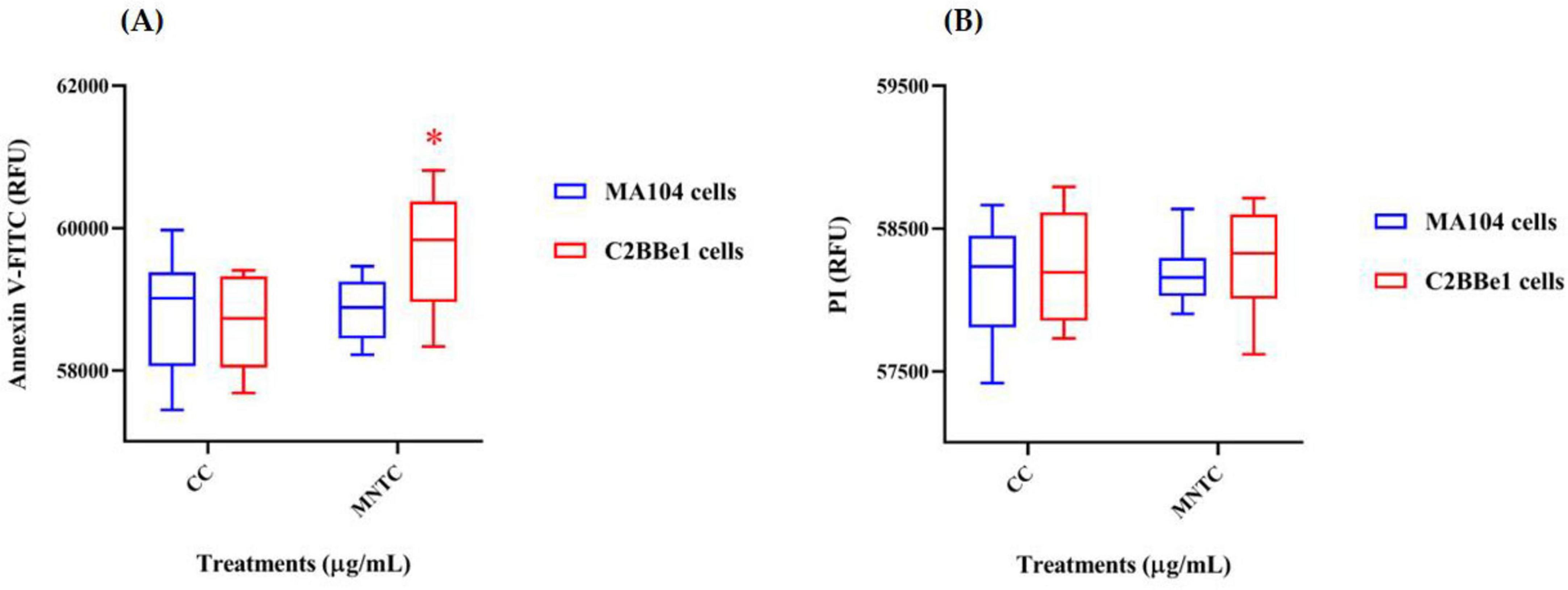 Figure 5. Evaluation of cell death markers in MA104 and C2BBe1 cells after BaP MNTC exposure. Evaluation of cell death markers following exposure to BaP MNTC in MA104 (blue boxes) and C2BBe1 (red boxes) cells for 8 days every 48 h and medium was partially refreshed at each point. (A) Phosphatidylserine translocation assessed using Annexin V-FITC (488 nm filter). (B) DNA fragmentation evaluated using propidium iodide (PI) fluorochrome (617 nm filter). Boxes represent the mean and interquartile range from three independent experiments with BaP MNTC exposure. Whiskers indicate the maximum and minimum values. Comparisons between the cell control (CC) and BaP MNTC were analyzed using Student’s t-test at a 95% confidence level. Significance levels are indicated as follows: *p ≤ 0.05. CC, cell control; H2O2 positive control.
