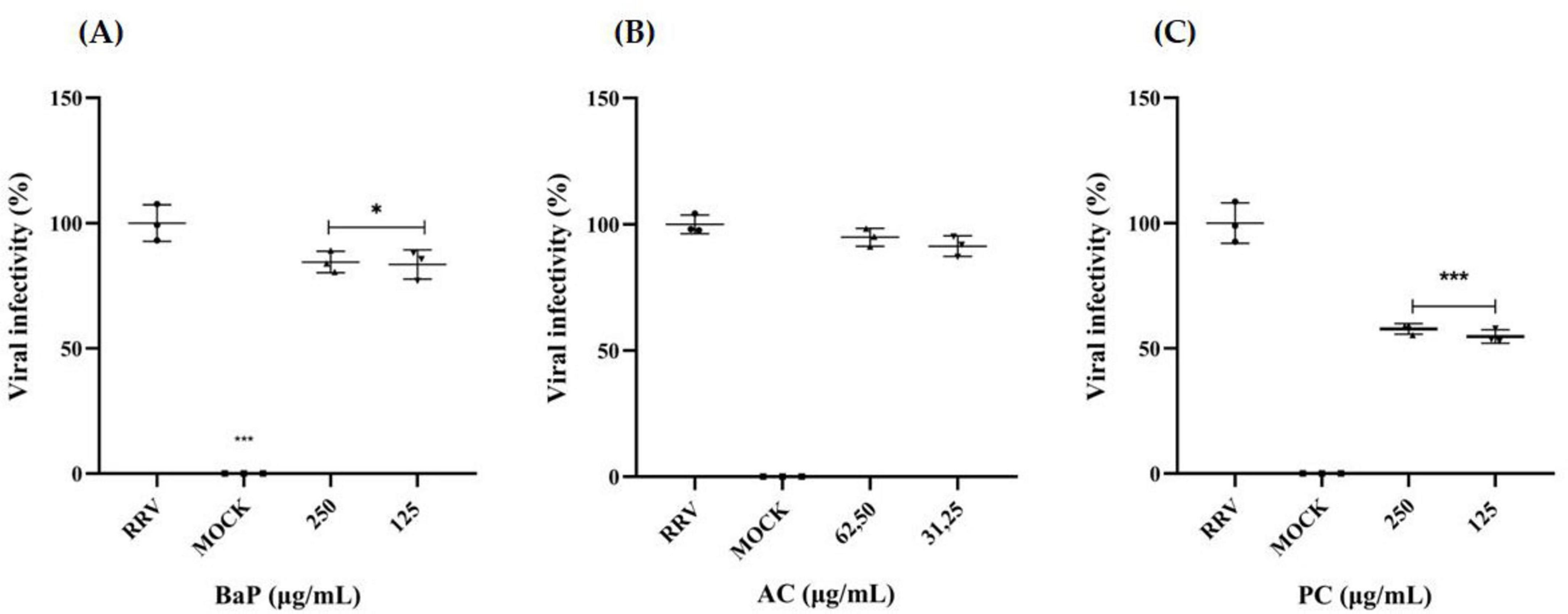 Figure 6. In vitro anti-rotavirus activity in MA104 Cells. Rhesus rotavirus (RRV) was co-incubated with two concentrations of (A) BaP, (B) AC, and (C) PC for 1 h at 37°C. MA104 cells were subsequently exposed to the BaP/AC/PC-RRV mixture and incubated for an additional 9 h. Viral infection levels were quantified using immunofluorescence to measure FFU/mL, with infection percentages calculated relative to the positive infection control (RRV). The scatter plot displays mean values with error bars representing standard deviation from three independent samples. Comparisons between the infection positive control (RRV) and BaP treatments were analyzed using Student’s t-test at a 95% confidence level, with significance levels indicated as follows: *p ≤ 0.05, ***p ≤ 0.001. RRV, infection positive control; MOCK, uninfected control. Photographs were captured using an Olympus CKX-41 inverted microscope (Olympus Corporation, Tokyo, Japan) equipped with a Lumin Epi-Fluorescence Module and a Moticam camera with MoticImages software, at 100× magnification. The images display Fluorescent Focus Units (FFU) in green, representing RRV-infected cells.