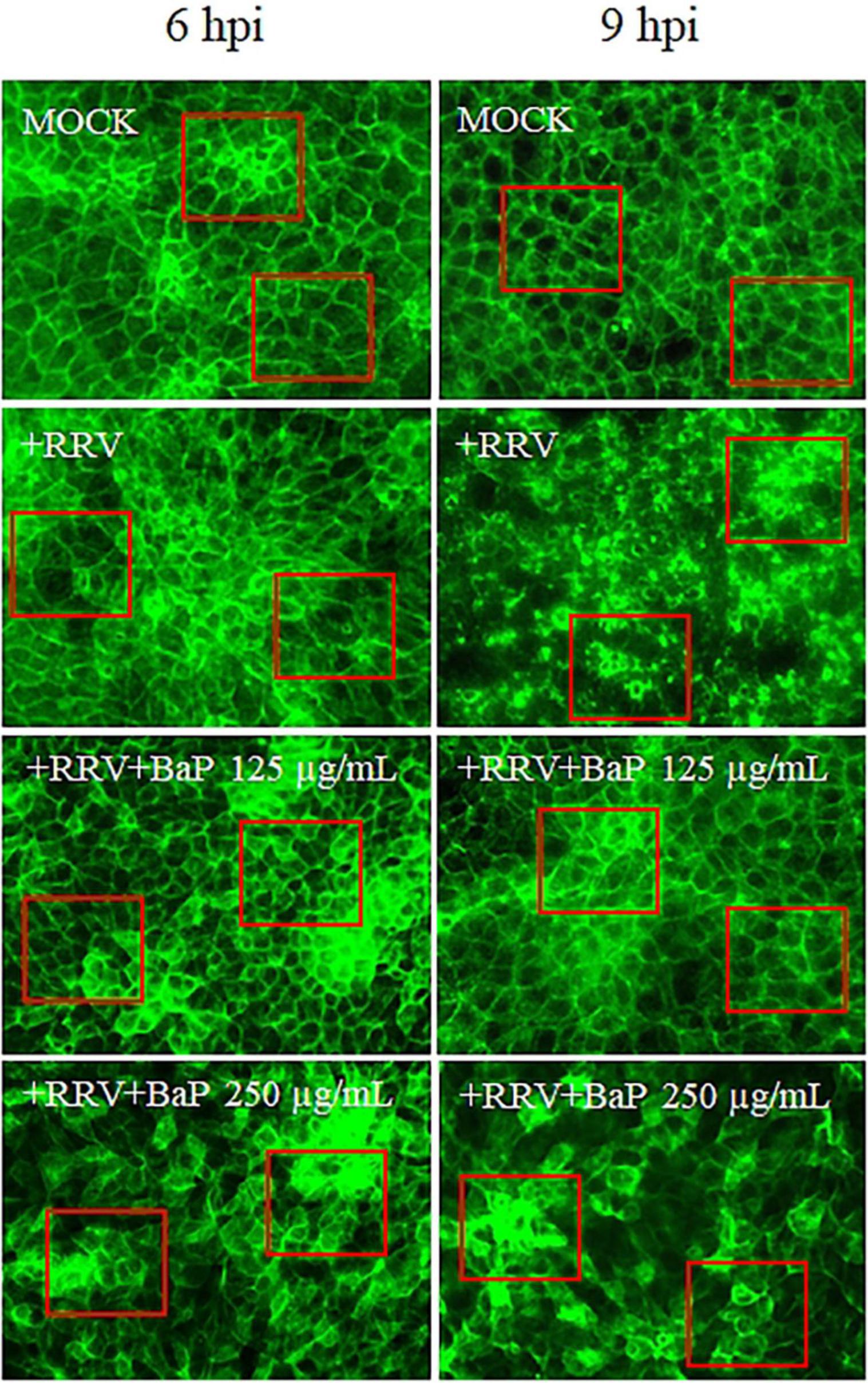 Figure 7. Effect of BaP at MNTC and half-maximal concentration on cytoskeletal architecture in RV-Infected C2BBe1 cells at 6 and 9 hpi. Photomicrographs display cell morphology and distribution in uninfected control cells (MOCK), infected untreated control cells (+RRV), and each BaP treatment condition. Green fluorescence (F-actin) indicates cytoskeletal organization. Red boxes highlight representative areas where morphological changes and differences in F-actin organization are most evident.