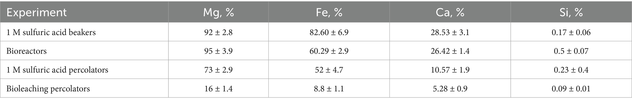 The magnesium concentration in bioreactors reached approximately 10 g/L (10,000 ppm) corresponding to a Mg extraction of 95 ± 3.9%. Final extractions of Fe, Ca and Si were 60.29 ± 2.9%, 26.42 ± 1.4% and 0.5 ± 0.07%. A two-sample t-test showed no statistically significant difference between Mg extractions during bioleaching experiment in bioreactors and leaching with 1 M sulfuric acid in chemical reactors (t = 0.61, p = 0.59). Application of the two-sample t-tests comparing Mg leaching in (1) chemical reactors versus percolators and (2) bioreactors versus percolators showed that the differences in Mg extractions were statistically significant (p < 0.05). Final concentrations of magnesium after dissolution with sulfuric acid and microbially mediated dissolution in percolators were approximately 19 g/L (19,000 ppm) and 4 g/L (4,000 ppm), respectively, corresponding to magnesium extractions of 73 ± 2.9% and 16 ± 1.4%. Extractions of Fe, Ca and Si after sulfuric acid dissolution in percolators were 52 ± 4.7%, 10.57 ± 1.9% and 0.23 ± 0.4%, respectively. Dissolution with microbially generated sulfuric acid led to lower extractions of Fe, Ca and Si: 8.8 ± 1.1%, 5.28 ± 0.9 and 0.09% ± 0.01, respectively.