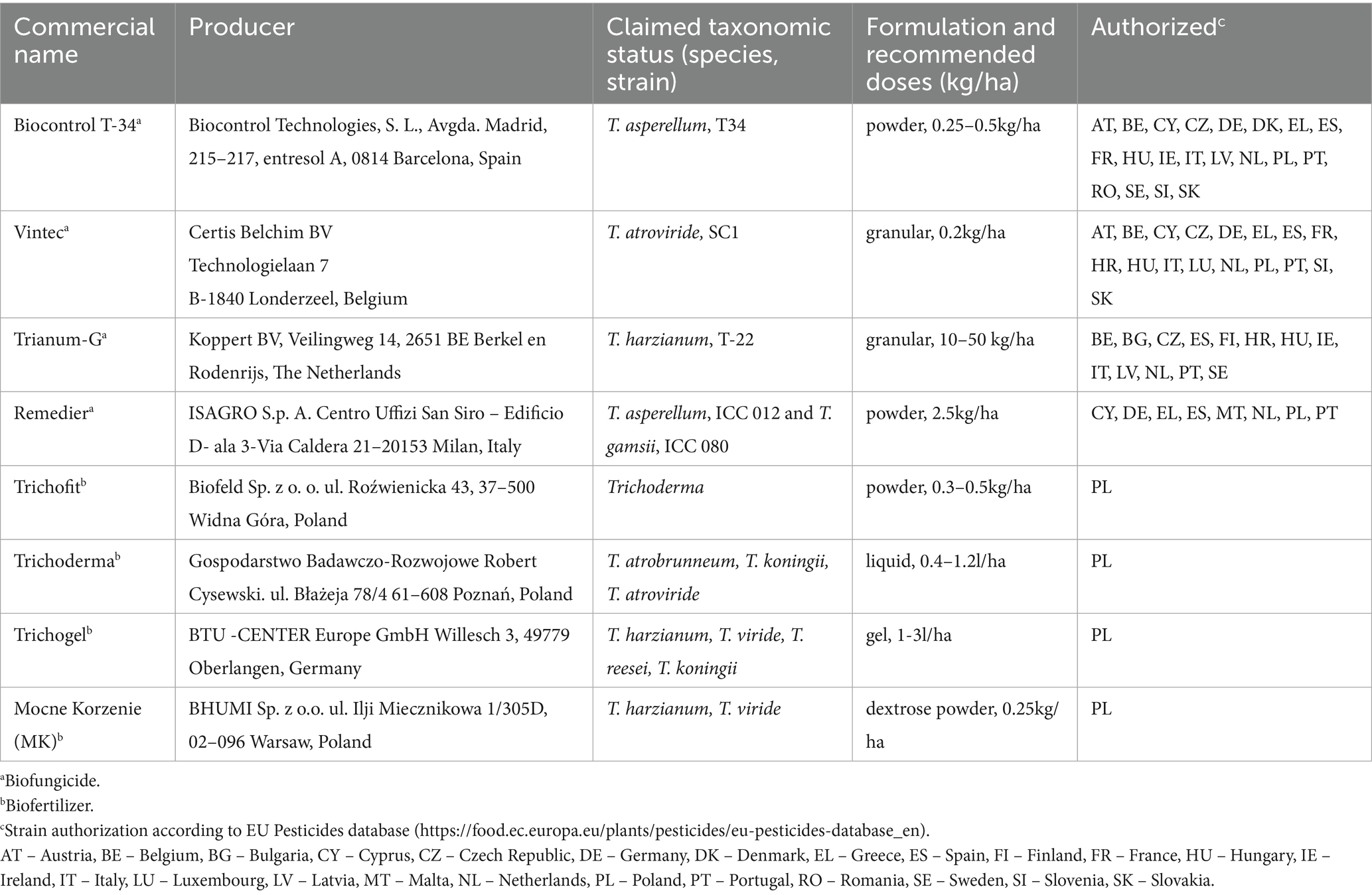It is worth noting that the regulatory landscape for biological products, influenced by European Union harmonization efforts, varies by country and features distinct guidelines that primarily focus on safety, efficacy, and ecological factors (Chandler et al., 2011). Fungal-derived products play a crucial role in sustainable and regenerative agriculture and are mostly available in the market as biofungicides and biofertilizers (syn. biostimulants) (Awad-Allah et al., 2022). Biofungicides are tailored to control pathogens and work best when applied preventively before disease development (Yao et al., 2023). Biofertilizers are generally designed to provide numerous benefits to the soil, directly or indirectly accelerating plant growth and improving the stress tolerance of crops (Mahanty et al., 2017). While Trichoderma strains are approved as active substances for pesticides under EU Regulation (EC) no 1107/2009, their status as biofertilizers is more complex. The EU’s harmonized list for microbial biostimulants (Component Material Category 7) is currently limited to genera such as Azotobacter and Rhizobium, excluding Trichoderma. This means Trichoderma biostimulants rely on national regulations (Chandler et al., 2011), such as those in Poland, where authorization from the Minister of Agriculture requires extensive efficacy data. Organizations like the European Biostimulants Industry Council (EBIC) are lobbying for the expansion of this EU list (European Biostimulant Industry Council, 2025; European Union, 2025)