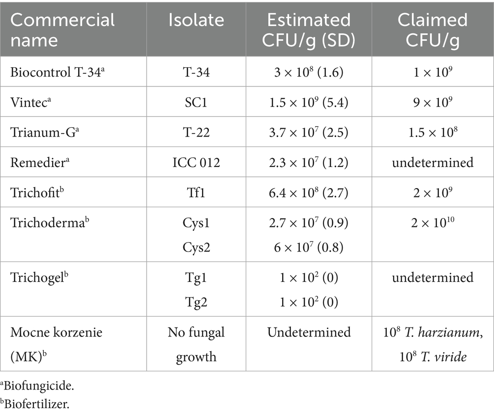 Fungi of the genus Trichoderma have gained significant attention in agriculture due to their multifaceted roles as biocontrol agents, enhancers of soil health, and promoters of plant growth. A variety of products harnessing these beneficial fungi have been commercially developed, leading to a prominent position in the global market (Tyśkiewicz et al., 2022). One key aspect of product labeling is the viability of spores, commonly represented as CFUs (Mulatu et al., 2021). In our study, we found that all analyzed products contained a lower number of CFUs than advertised, with biofungicides displaying discrepancies ranging from 3.3 to 5 times fewer CFUs than claimed. Such discrepancies may be attributed to issues surrounding the limited shelf life and inherent instability commonly associated with biological products (Martinez et al., 2023). Notably, this inconsistency was exacerbated in biofertilizers, where two out of four products demonstrated a dramatic reduction in CFUs.