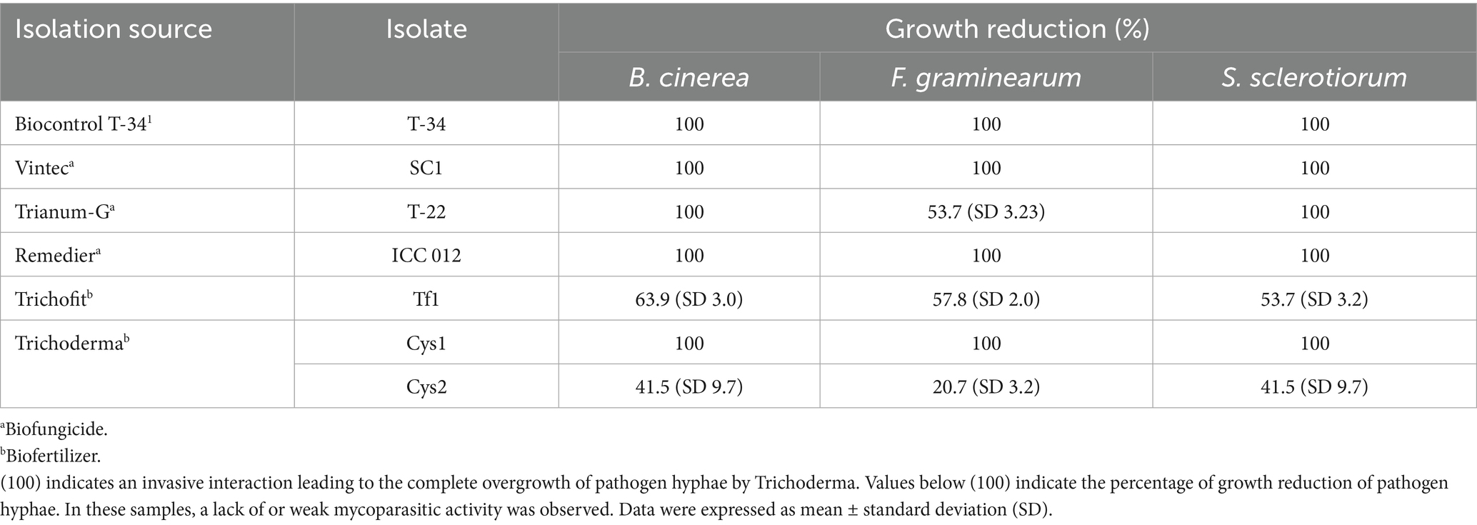 The biocontrol activity of Trichoderma isolates against B. cinerea, F. graminearum and S. sclerotiorum was assessed by confrontation coculture. The assays included four strains of Trichoderma (T34, SC1, T-22 and ICC012) recovered from biofungicides. In addition, based on the product data sheets of two biofertilizers: Trichofit and Trichoderma, which indicated the antifungal and mycoparasitic activity of their strains, we decided to include three strains (Tf1, Cys1 and Cys2) obtained from these two biofertilizers.