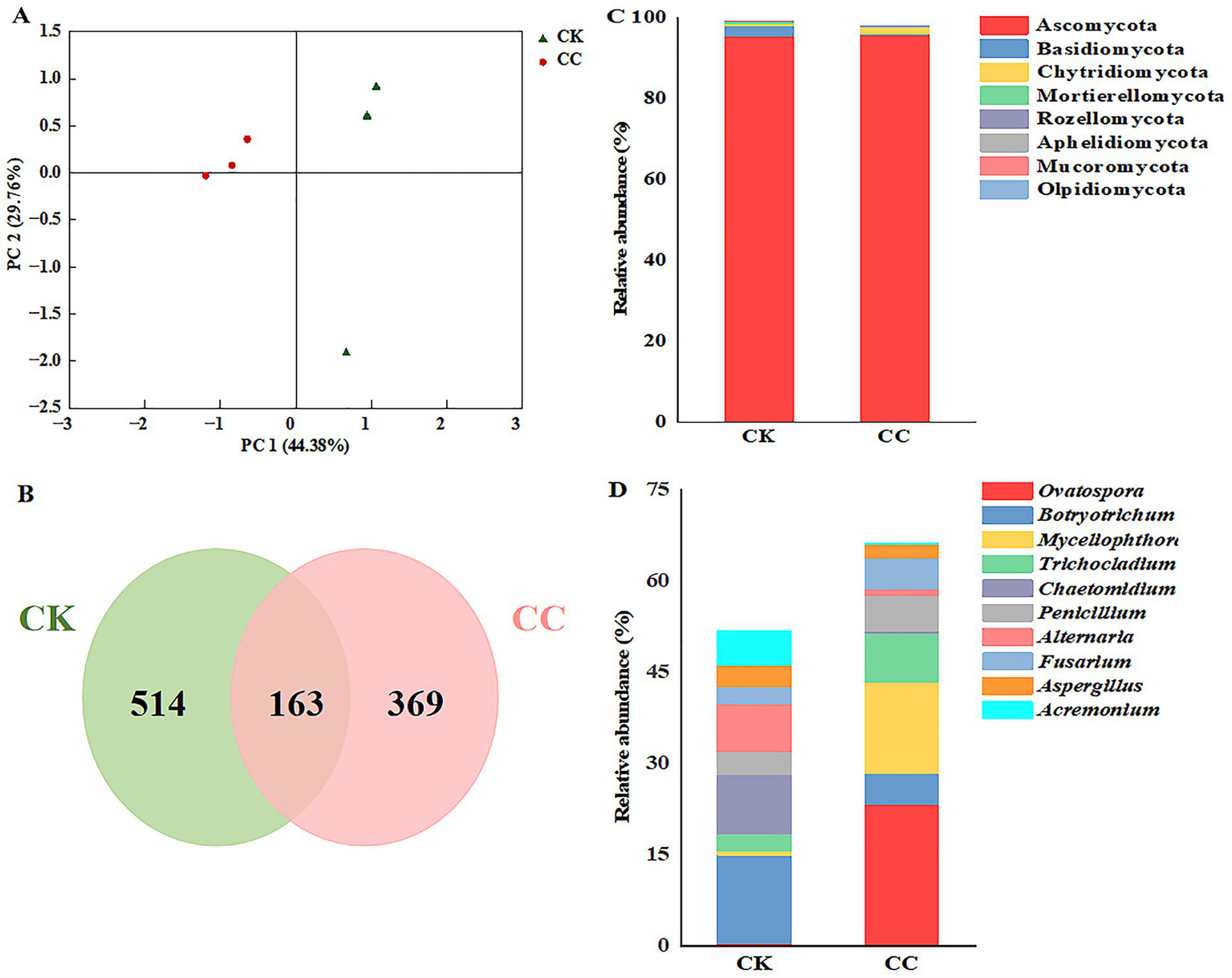Figure 6. The compositions of fungal taxa within the microbiome across various treatment groups. CC, continuous cropping; CK, non-continuous cropping. (A) PCoA plots of fungal communities at phylum level. (B) Venn diagram of fungal ASVs. (C,D) Fungal community structure at (C) phylum and (D) genus levels. (Average relative abundance (RA) > 1% at phyla level and genera level).