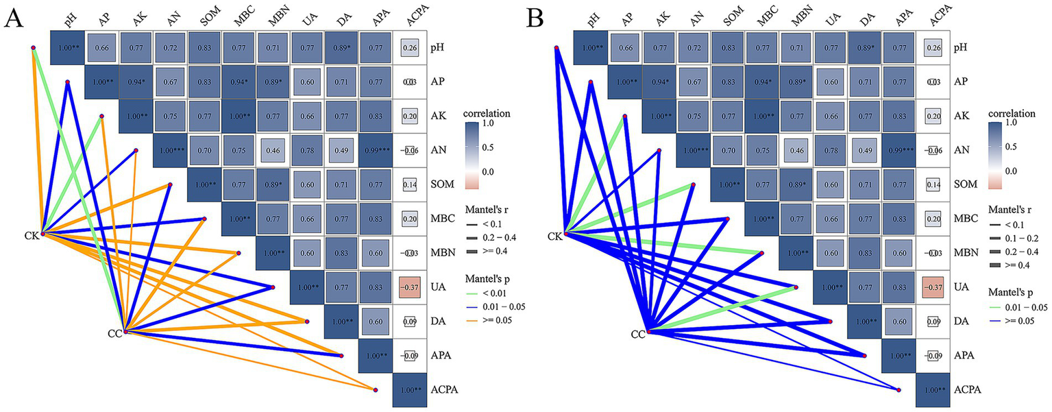 Figure 7. Mantal analysis of soil bacterial (A) and fungal (B) communities and soil biochemical properties under various treatment groups. pH; SOM, soil organic matter; AN, alkali-hydrolyzed N; AP, available P; AK, available K; UA, urease activity; DA, dehydrogenases activity; ACPA, acid phosphatase activity; APA, alkaline phosphatase activity; MBC, microbial biomass carbon; MBN, microbial biomass nitrogen.