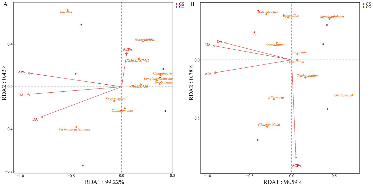 Figure 9. Analysis of redundancy of bacterial (A) and fungal (B) communities and soil enzyme activities under various treatment groups. UA, urease activity; DA, dehydrogenases activity; ACPA, acid phosphatase activity; APA, alkaline phosphatase activity.