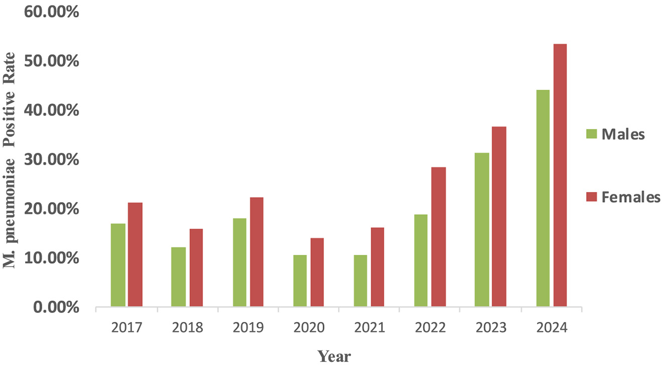 Epidemiological changes of M. pneumoniae antibody positive rates according to patient gender. M. pneumoniae positive rate were computed as the proportion of M. pneumoniae antibody positive individuals among all tested individuals of each gender. The detection of serum antibodies merely reflects prior exposure to M. pneumoniae and does not constitute definitive evidence of acute infection.