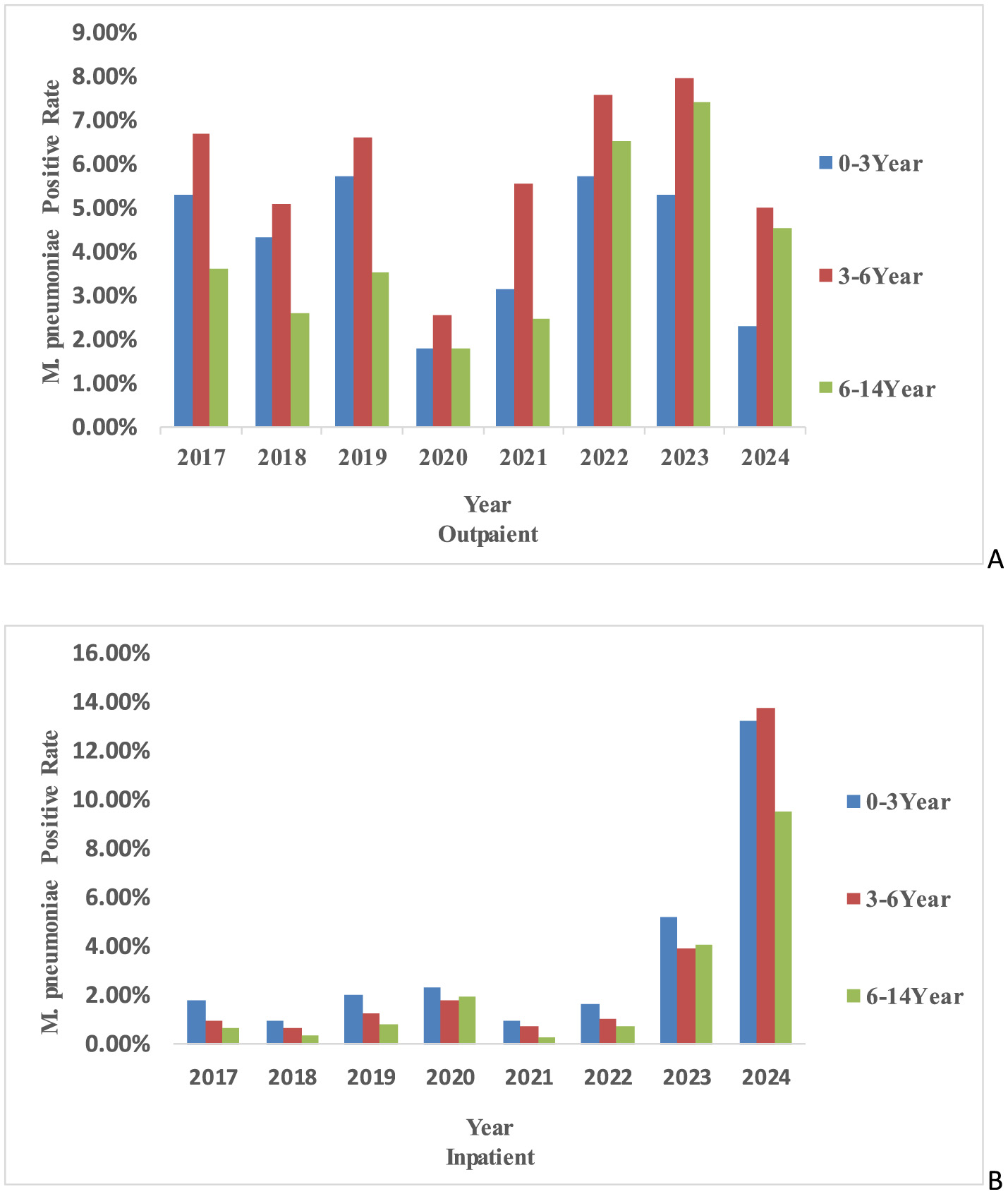 The age-specific trends of M. pneumoniae antibody positive rates. (A) The age-specific trends in outpatient M. pneumoniae antibody positive rates in different years. (B) Age-specific trends in inpatient M. pneumoniae antibody positive rates in different years.