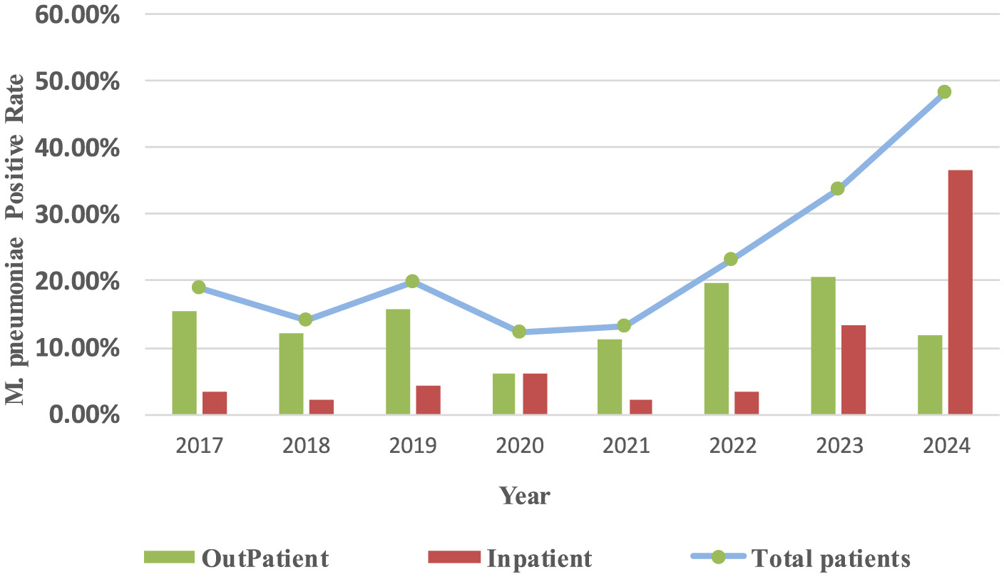 Yearly trends in M. pneumoniae antibody positive rates in different hospitalization methods and total positive rates.