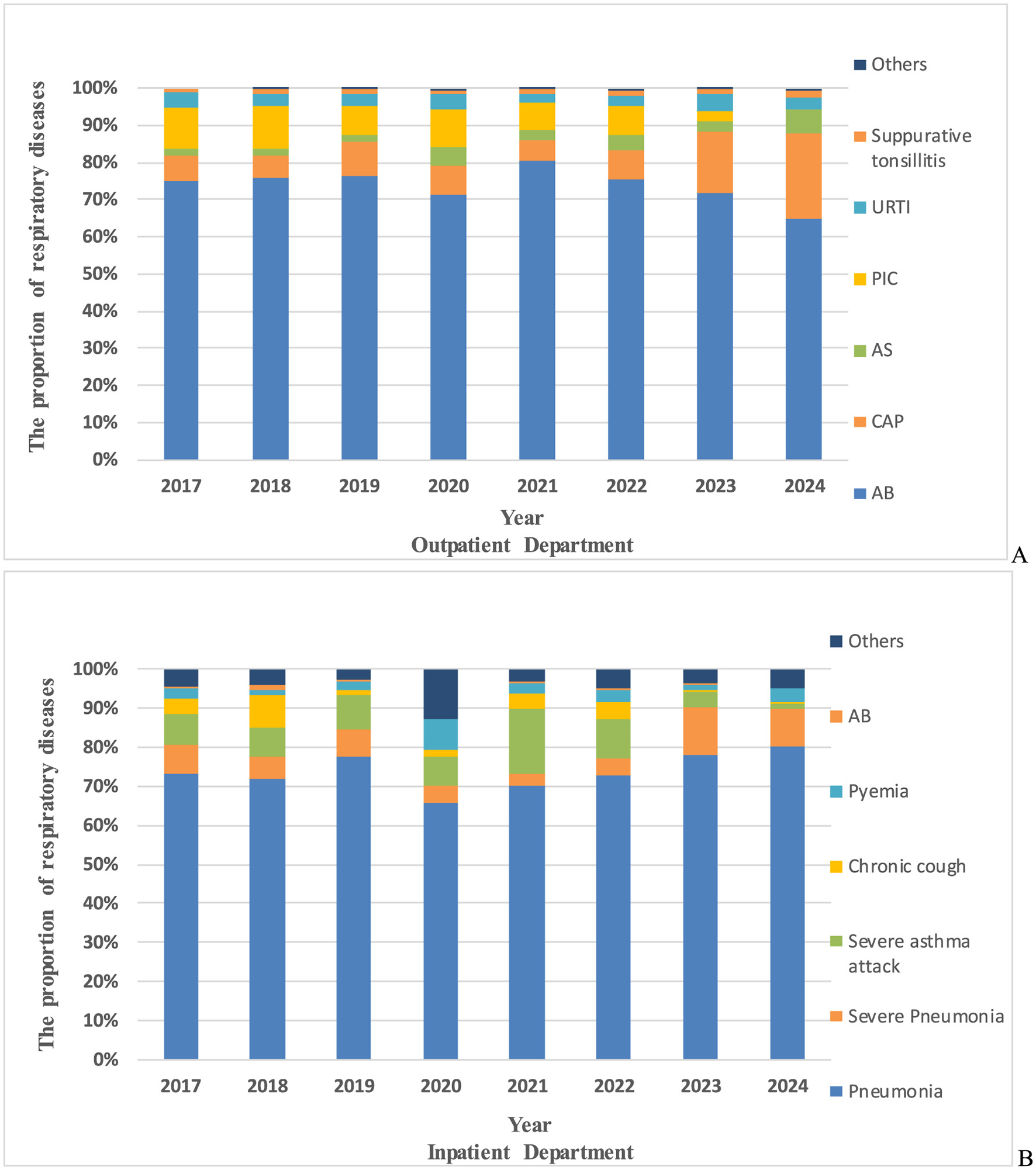 The proportion of respiratory diseases in M. pneumoniae antibody positive. (A) The proportion of respiratory diseases in M. pneumoniae antibody positive in outpatient department. (B) The proportion of respiratory diseases in M. pneumoniae antibody positive in inpatient department. AB, acute bronchitis; PIC, post-infectious cough; CAP, community acquired pneumonia; URTI, upper respiratory tract infection; AS, asthma; others, respiratory diseases other than these.