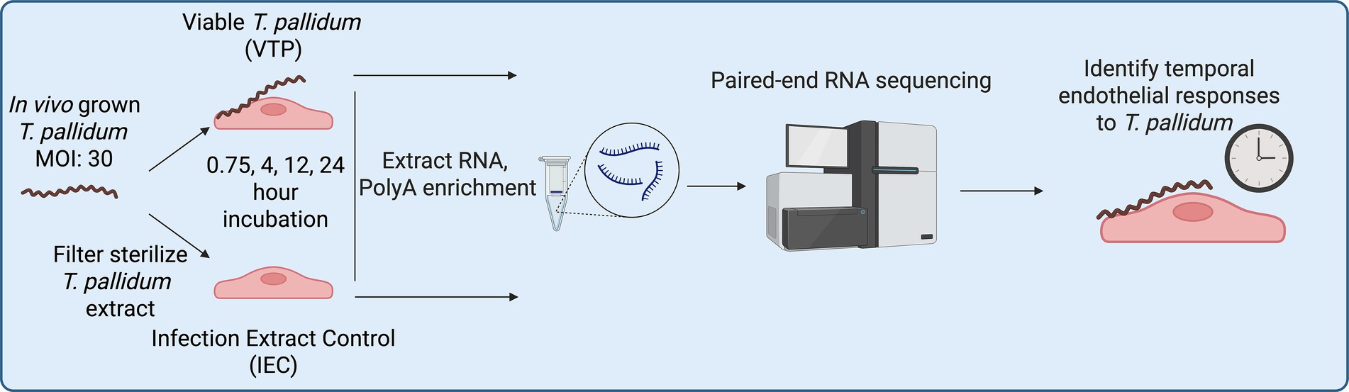 To expand on these findings and identify host signaling pathways that play a role in syphilis pathogenesis, the current study characterized the transcriptional response of the immortalized cell line HBMEC to T. pallidum exposure by time-course transcriptome sequencing (RNA-seq; Figure 1). These analyses reveal significant pathway convergence on endothelial to mesenchymal transition (EndMT), a dynamic process involved in various developmental, physiological, and pathological activities (Piera-Velazquez and Jimenez, 2019; Ciszewski et al., 2021) that contributes to vascular destruction in other infectious diseases, such as SARS-CoV-2 infection (Eapen et al., 2020). These characteristics of EndMT suggest potential relevance to the development of symptoms associated with infectious and congenital syphilis. The systems biology approach pursued in this study provides insight into molecular signaling and cellular transformations occurring in the host that collectively shape the course of T. pallidum infection.