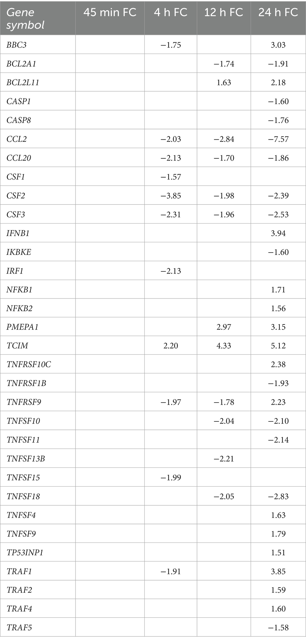 TNF hallmark gene sets were differentially regulated at all timepoints in the present study, where the “TNF-ɑ signaling through NF-κB” gene set demonstrated both significant up- and downregulation, reflecting the diverse roles of differentially expressed genes within these pathways (Figures 5, 7; Supplementary Tables 6–13). Indeed, genes encoding TNF receptors (TNFRs) were downregulated from 4- to 12-h and were both up- and downregulated at 24-h (Table 4; Supplementary Table 1). TNFR adaptors such as the TRAF (TNF-receptor-associated factor) family exhibited differential expression, primarily at the 24-h timepoint (Table 4; Supplementary Table 1). Immune signaling genes downstream of both IFN and TNF, such as the NF-κB factors TCIM (Transcriptional and Immune Response Regulator), NFKB1, NFKB2, and RelB, were upregulated, while the NF-κB inhibitor IKBKE (Inhibitor of nuclear factor Kappa-B Kinase subunit Epsilon) was downregulated (Table 4; Supplementary Table 1). Collectively these findings indicate T. pallidum exposure alters TNF, IFN signaling, NF-κB signaling and the endothelial immune response to T. pallidum.