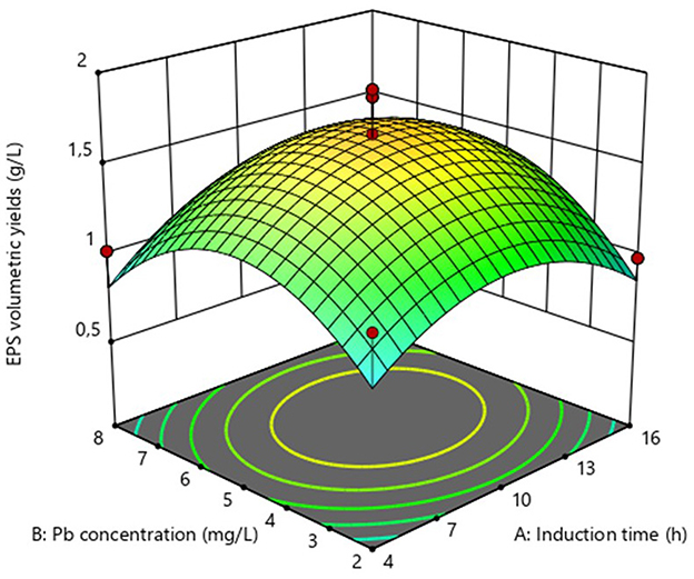 where, y is the volumetric EPS yield, A is the Pb induction time and B is the Pb concentration. The regression coefficient data for the coded model equation is summarized in Supplementary Table 1. The negative sign on the quadratic terms further illustrates that the EPS volumetric yield reaches a maximum level before it starts to decline, as the Pb induction concentration and time increase.