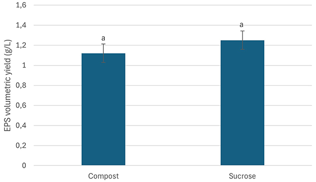 Figure 3. EPS volumetric yields from Bacillus MHSD_36 cultured in medium containing compost or/sucrose as carbon sources. The experiments were performed in triplicates and data reported as mean ± standard. The similar letters above the bars show that the difference in the data is not statistically significant.