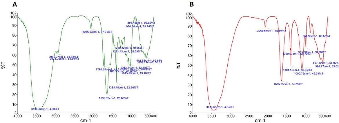 Figure 4. FTIR spectrum of the EPS extracted from the sucrose (A) based media and compost media (B) cultures of Bacillus MHSD_36.