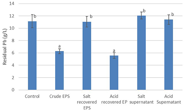 Figure 5. Pb recovery using crude EPS, acid recovered/recycled EPS and salt recovered/recycled EPS. The experiments were performed in triplicates and data reported as mean ± standard deviation. Different letters above the bars indicate statistically significant difference.