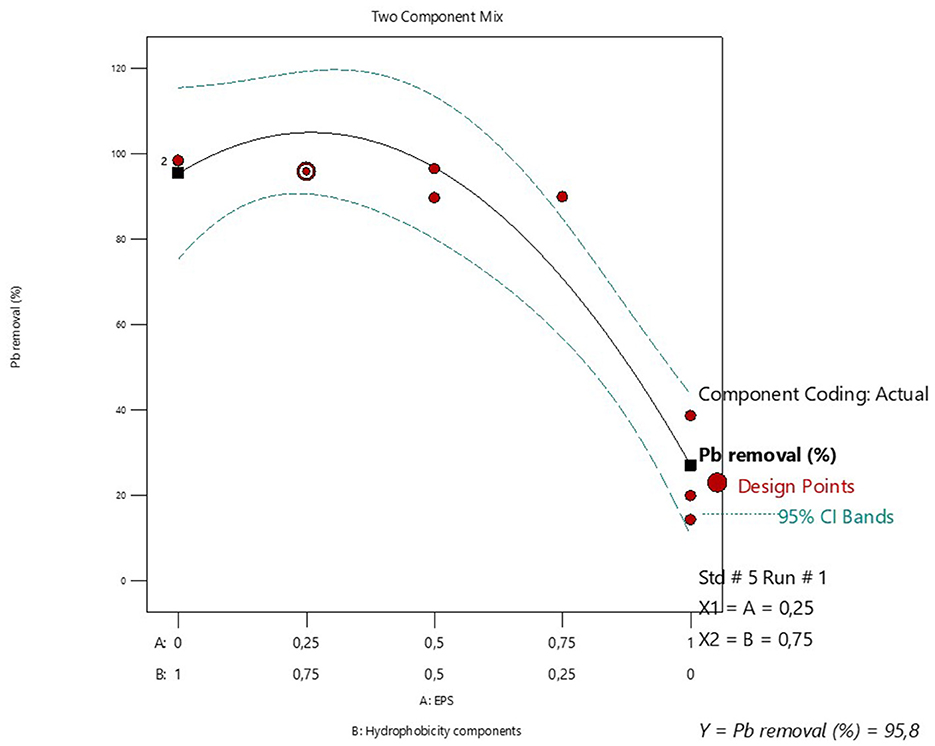 Figure 6. Mixture design for optimizing the proportions of EPS and hydrophobicity components for maximum Pb adsorption and recovery.