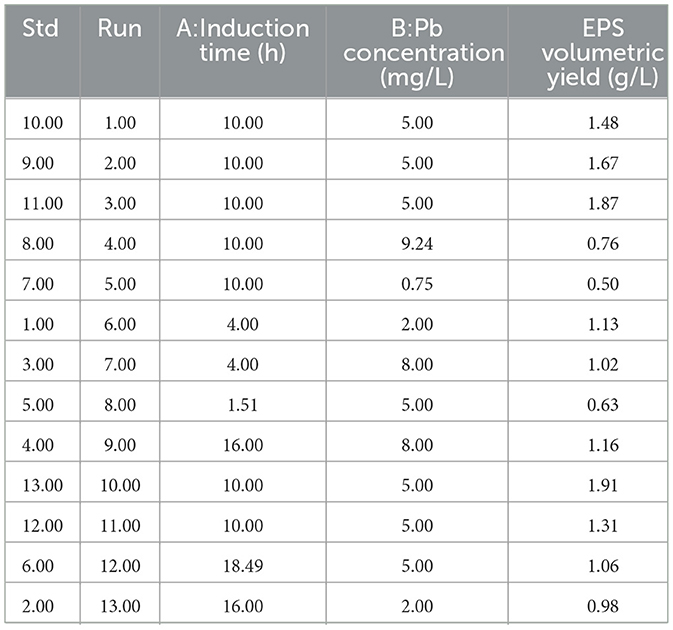 Table 1. Experimental design for the optimization of extracellular polymeric substance yields through lead stress induction.