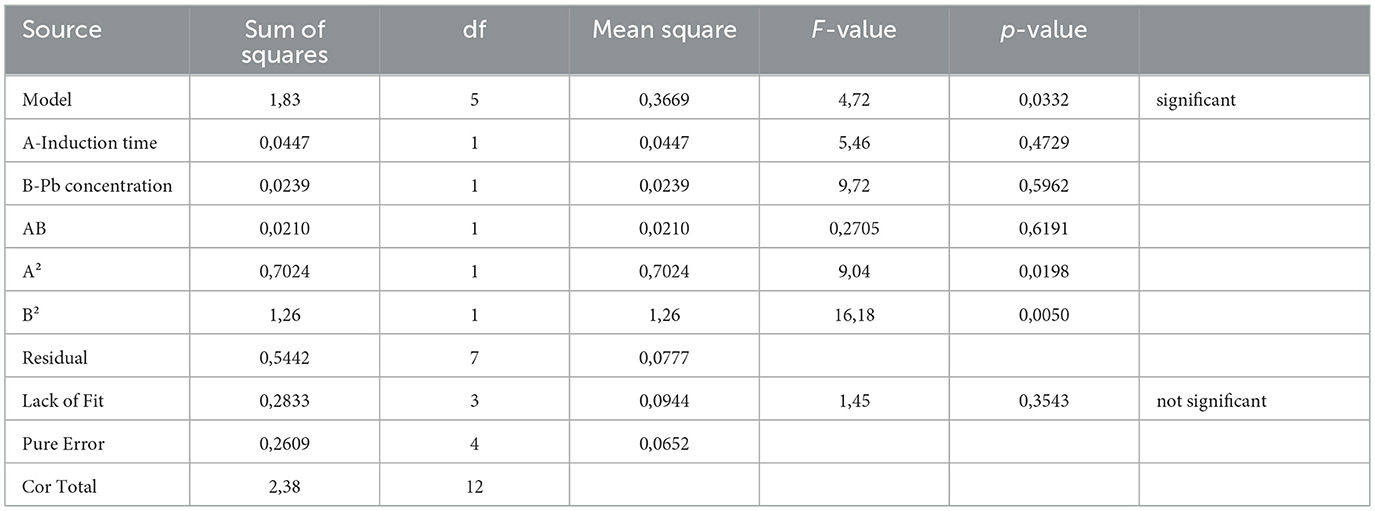 EPS production was enhanced through exposing the bacterial culture, described in the preceding section, to stress. A five-coded levels central composite design (CCD) was used to determine the impact of Pb concentration and induction time on EPS production. The experiment had 13 runs including 5 center points (Table 1). The factors were in the following range, Pb concentration (0.75, 2, 5, 8, 9.24 mg/L) (Huang et al., 2025) and induction time (1.5, 4, 10, 16, 18.5). The general formula for the response is shown in the equation below: