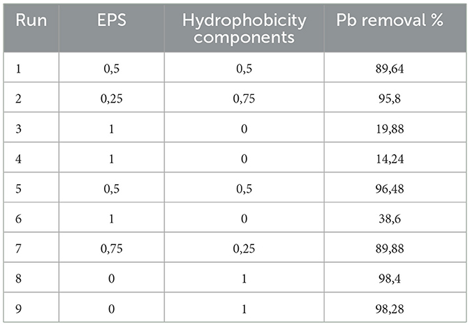 Table 4. Mixture design to determine the optimal proportion of EPS and hydrophobicity components for Pb biosorption.