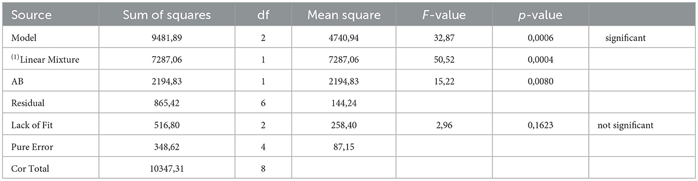 The ANOVA for the mixture design (Table 5) shows that both the linear and interactive terms of the mixture model were statistically significant. The statistically significant interactive term (AB) is a further indication of the synergistic interaction between EPS and hydrophobicity components in Pb biosorption. In addition, the R2 and adjusted R2 value is 0.9164 and 0.8885, respectively, thereby inferring that 88.85% variation in Pb biosorption is attributable to EPS and hydrophobicity components. The residual analyis (Supplementary Figure 3) shows that the residuals were independent and that no correlation existed between the residuals and predicted response. The residuals also had normal distribution (Supplementary Figure 4). The coded model Equation 4, based on the regresssion analysis (Supplementary Figure 3) is shown below;