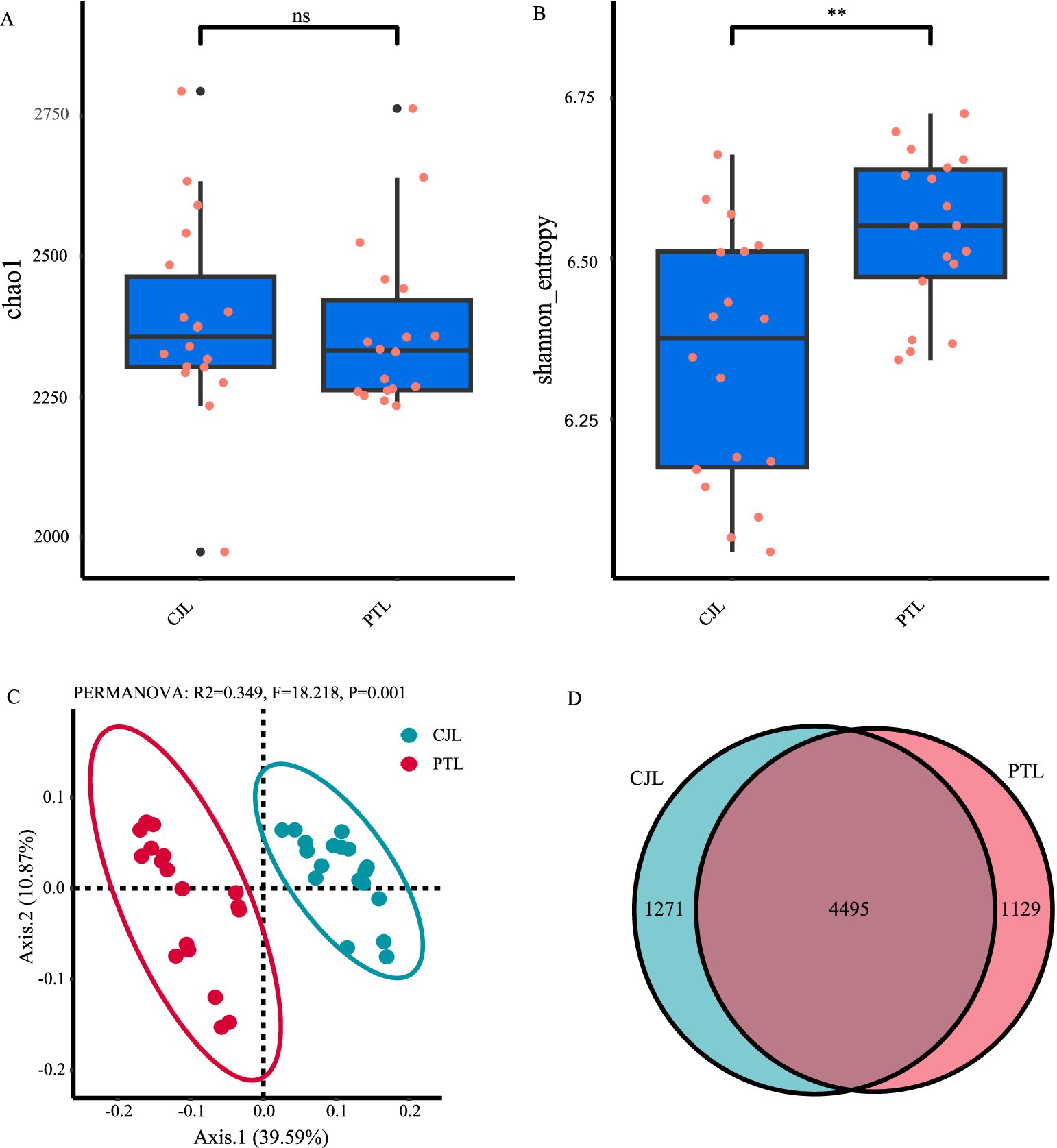 To assess the microbial community diversity, we utilized the Chao1 index, which reflects community richness, and the Shannon index, which accounts for both richness and evenness. The results showed that there was no significant difference in the Chao1 index between the rhizosphere soil microbial communities of the two rootstock lemons (Figure 1A). However, the Shannon index was significantly higher in PTL compared to CJL (Figure 1B; p < 0.01). Beta diversity analysis of the rhizosphere soil microbial communities of the two rootstocks was conducted using principal coordinate analysis (PCoA). The results revealed that the first principal component (Axis 1) explained 39.59% of the variation, while the second principal component (Axis 2) explained 10.87% (Figure 1C). The microbial community compositions of the two groups were significantly separated, indicating that the rootstock types affects the structure and composition of the rhizosphere soil microbial community. A Venn diagram further illustrated the species overlap between the two groups. The results showed that CJL and PTL shared 4,495 species, with 1,271 species unique to CJL and 1,129 species unique to PTL (Figure 1D).