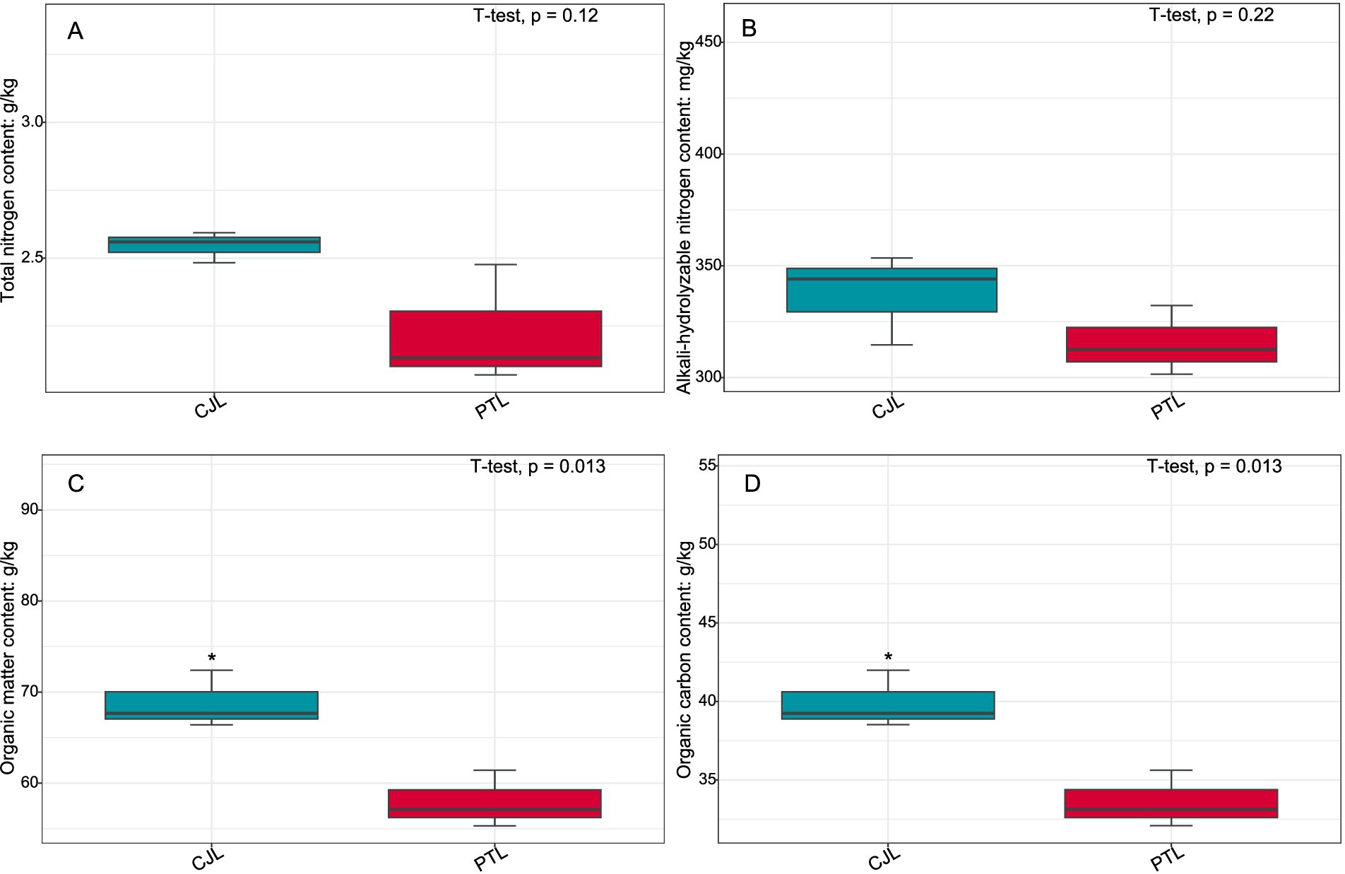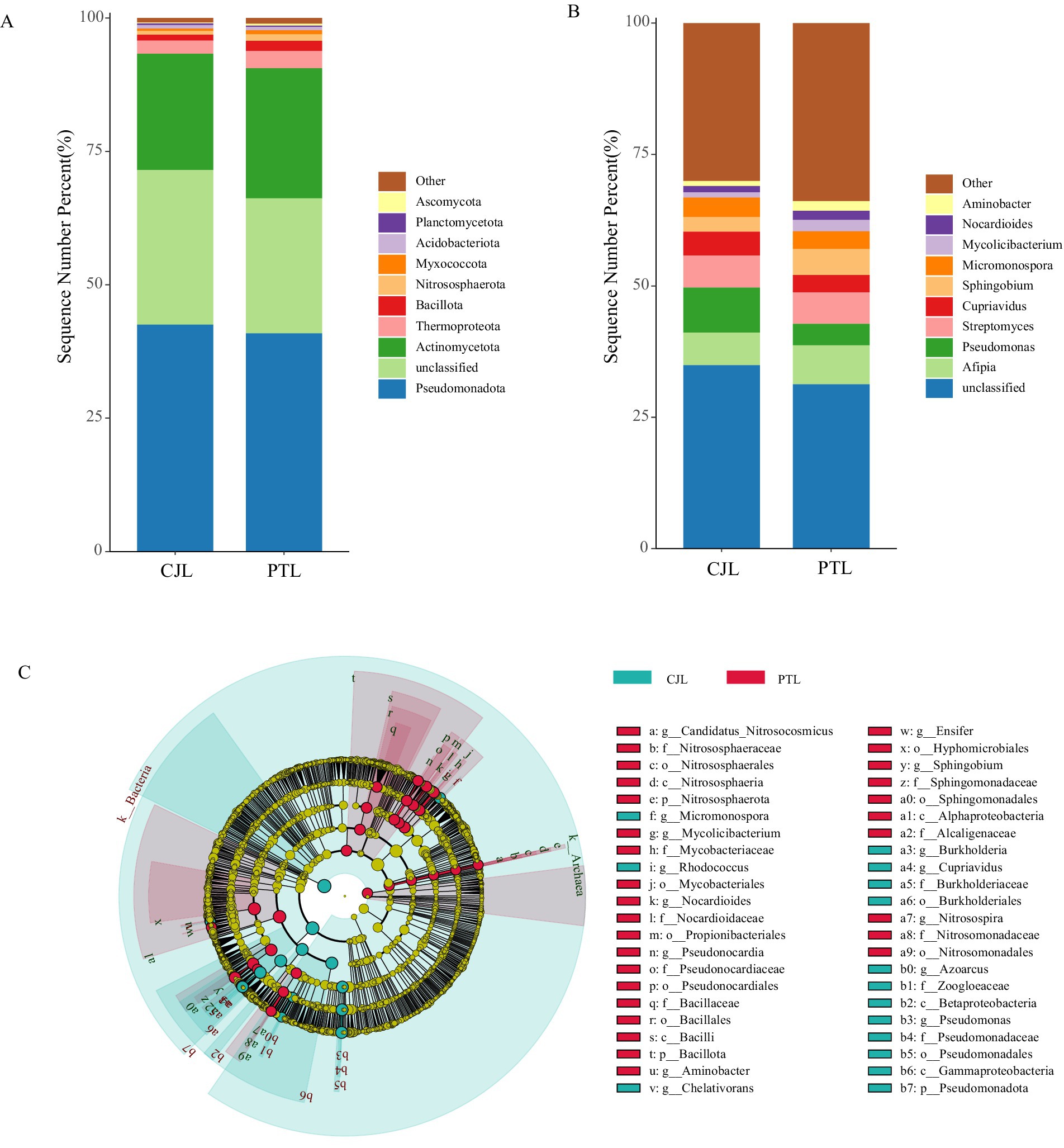 Building upon LEfSe analysis with a significance threshold (LDA score > 3.5), differentially abundant microbes were predominantly identified within three phyla: Actinomycetota, Pseudomonadota, and Nitrososphaerota (Figure 2C). Specifically, CJL-associated microbiota comprised seven enriched genera: Micromonospora, Rhodococcus, Chelativorans, Burkholderia, Cupriavidus, Azoarcus, and Pseudomonas. In contrast, PTL-associated microbiota revealed eight enriched genera: Nitrosospira, Sphingobium, Ensifer, Aminobacter, Pseudonocardia, Nocardioides, Mycolicibacterium, and Candidatus Nitrosocosmicus. Notably, four key taxa exhibited significantly higher discriminatory power (LDA score > 4): Pseudomonas (class Gammaproteobacteria), Cupriavidus (class Betaproteobacteria), and Burkholderia (class Betaproteobacteria) enriched in CJL; and Sphingobium (class Alphaproteobacteria) enriched in PTL. These high-impact microorganisms were consequently prioritized as focal differential populations.
