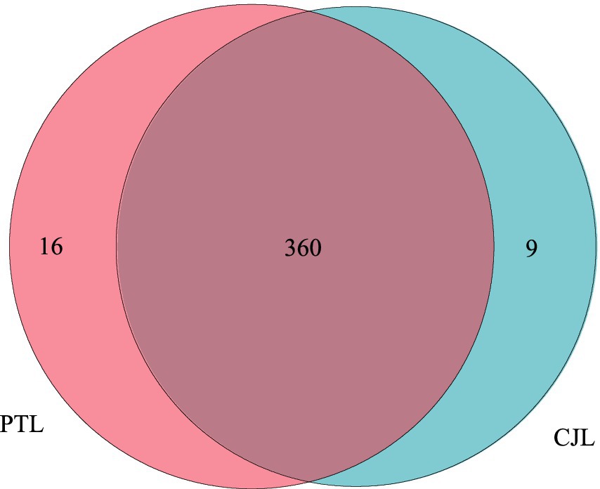 Figure 3. Venn diagram of annotated metabolic pathways. The 16 unique pathways in PTL were: (1) Metabolism; Glycan biosynthesis and metabolism; Glycosphingolipid biosynthesis-ganglio series. (2) Metabolism; Metabolism of terpenoids and polyketides; Type I polyketide structures. (3) Environmental Information Processing; Signal transduction; MAPK signaling pathway. (4) Organismal Systems; Immune system; Chemokine signaling pathway. (5) Cellular Processes; Transport and catabolism; Autophagy-other. (6) Organismal Systems; Development and regeneration; Axon guidance. (7) Environmental Information Processing; Signal transduction; VEGF signaling pathway. (8) Organismal Systems; Development and regeneration; Osteoclast differentiation. (9) Cellular Processes; Cellular community-eukaryotes; Signaling pathways regulating pluripotency of stem cells. (10) Organismal Systems; Immune system; Toll-like receptor signaling pathway. (11) Organismal Systems; Immune system; Toll and Imd signaling pathway. (12) Organismal Systems; Immune system; Natural killer cell mediated cytotoxicity. (13) Organismal Systems; Immune system; B cell receptor signaling pathway. (14) Organismal Systems; Immune system; Fc epsilon RI signaling pathway. (15) Organismal Systems; Immune system; Fc gamma R-mediated phagocytosis. (16) Human Diseases; Endocrine and metabolic disease; AGE-RAGE signaling pathway in diabetic complications. The 9 unique pathways in CJL were: (1) Environmental Information Processing; Signal transduction; NF-kappa B signaling pathway. (2) Environmental Information Processing; Signal transduction; Notch signaling pathway. (3) Environmental Information Processing; Signal transduction; Hedgehog signaling pathway-fly. (4) Environmental Information Processing; Signal transduction; TGF-beta signaling pathway. (5) Organismal Systems; Environmental adaptation; Circadian rhythm-plant. (6) Human Diseases; Endocrine and metabolic disease; Maturity onset diabetes of the young. (7) Human Diseases; Substance dependence; Morphine addiction. (8) Human Diseases; Substance dependence; Nicotine addiction. (9) Human Diseases; Cancer_specific types; chronic myeloid leukemia.