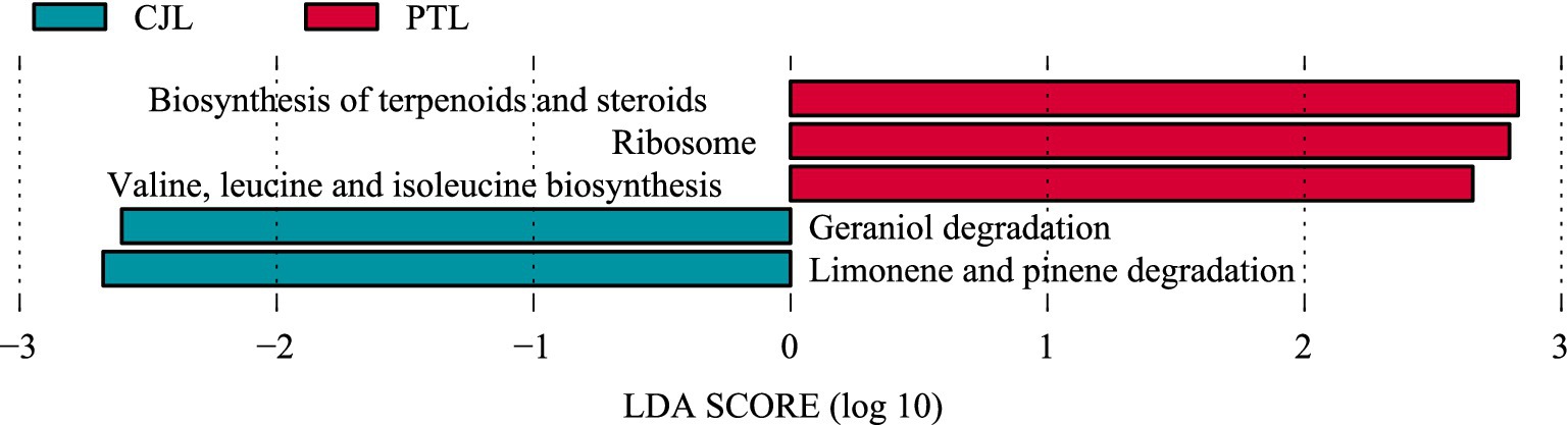 LEfSe analysis (LDA score > 2) identified 52 metabolic pathways with statistically significant intergroup differences. Thirty pathways were significantly enriched in the CJL, while 22 showed marked enrichment in PTL. Among these, five characteristic pathways achieved an LDA threshold > 2.5 (Figure 4). The PTL exhibited enrichment in three pathways: Biosynthesis of terpenoids and steroids, Ribosome, and Valine, leucine and isoleucine biosynthesis. Conversely, the CJL demonstrated enrichment in Limonene and pinene degradation and Geraniol degradation. Notably, CJL showed preferential enrichment in catabolic pathways (e.g., terpenoid degradation, benzoate degradation, and fatty acid degradation) and amino acid metabolism (e.g., valine/leucine/isoleucine degradation and histidine metabolism). In contrast, PTL exhibited dominance in genetic information processing (e.g., transcription, DNA repair, and DNA replication), antibiotic biosynthesis (e.g., vancomycin resistance and streptomycin biosynthesis), and cofactor/vitamin biosynthesis (e.g., pantothenate and CoA biosynthesis).