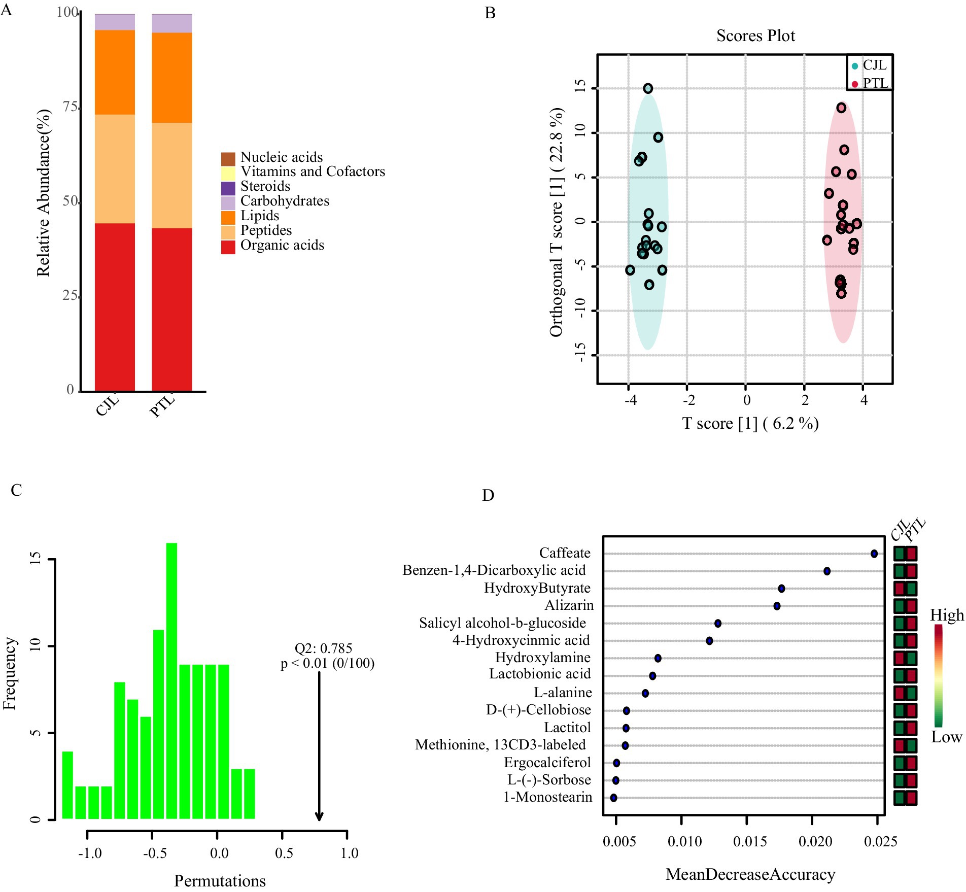 Random forest analysis further identified 15 discriminative metabolites (Figure 5D). Four metabolites were significantly enriched in CJL: Hydroxybutyrate, Hydroxylamine, L-Alanine, and 13CD₃-labeled Methionine. Elevations in PTL included 11 metabolites: Caffeate, Terephthalic acid (Benzen-1,4-dicarboxylic acid), Alizarin, Salicin (Salicyl alcohol-β-glucoside), 4-Hydroxycinnamic acid, Lactobionic acid, D-(+)-Cellobiose, Lactitol, Ergocalciferol (Vitamin D₂), L-Sorbose, and 1-Monostearin.