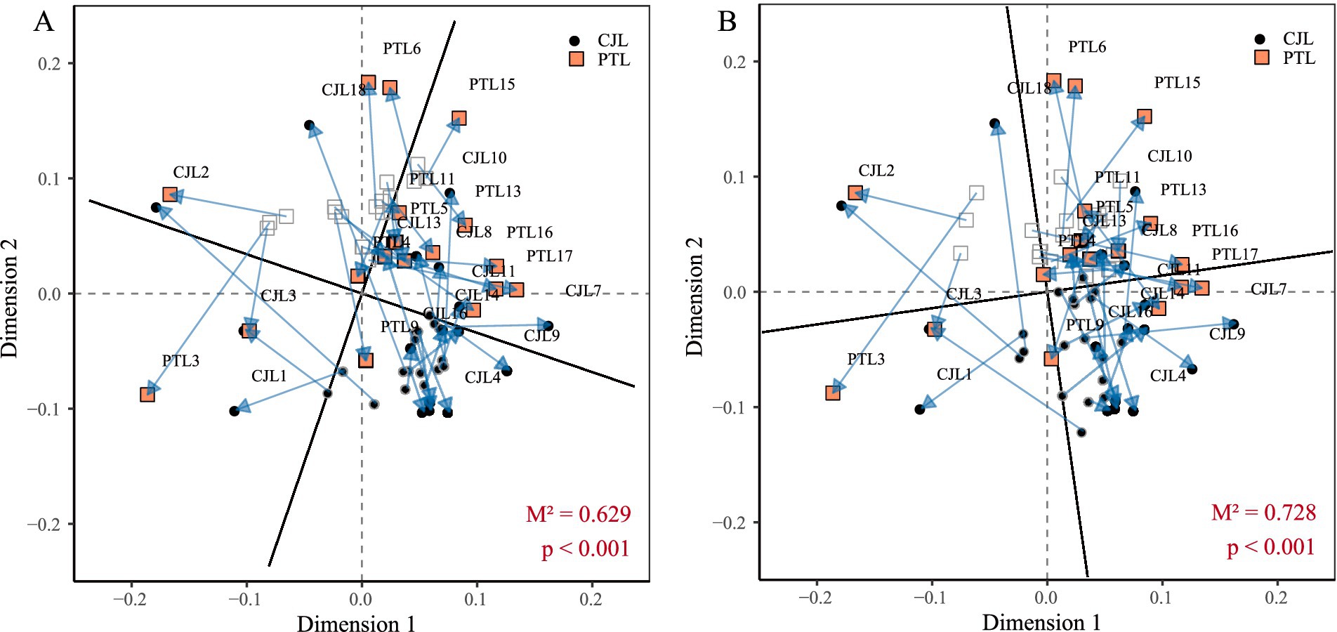 Figure 6. Procrustes analysis. (A) Species-metabolite Procrustes analysis. (B) Functional-metabolite Procrustes analysis.