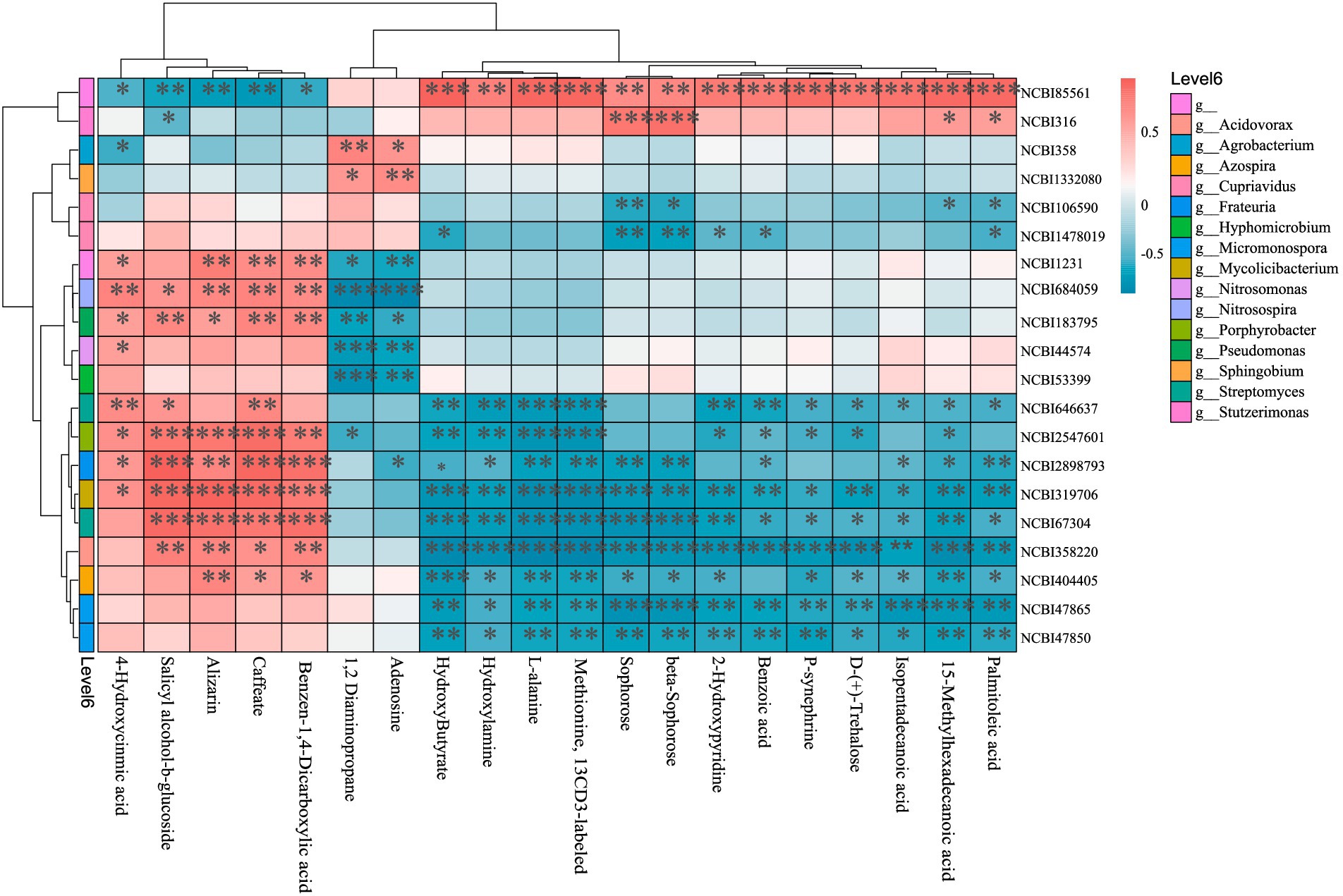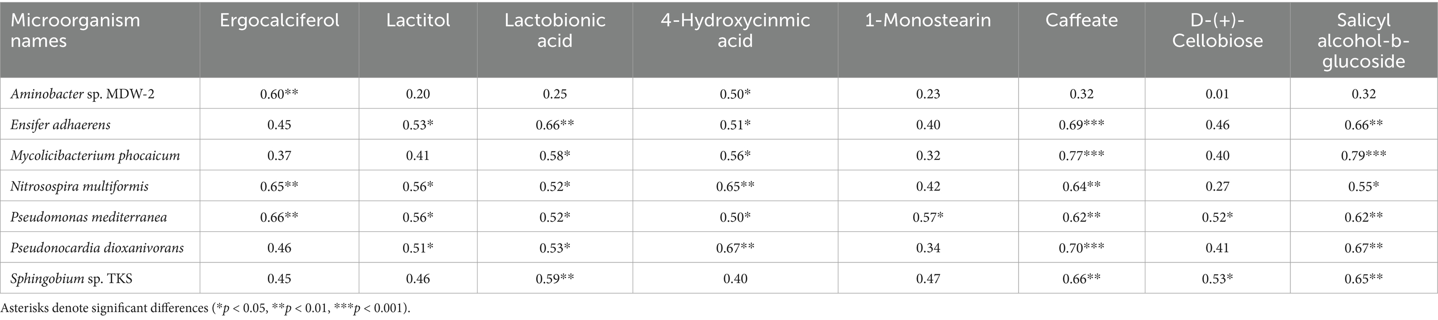 Table 2. Correlations between relative abundance of root-enriched specific microorganisms and rhizosphere metabolites under CJL treatment.