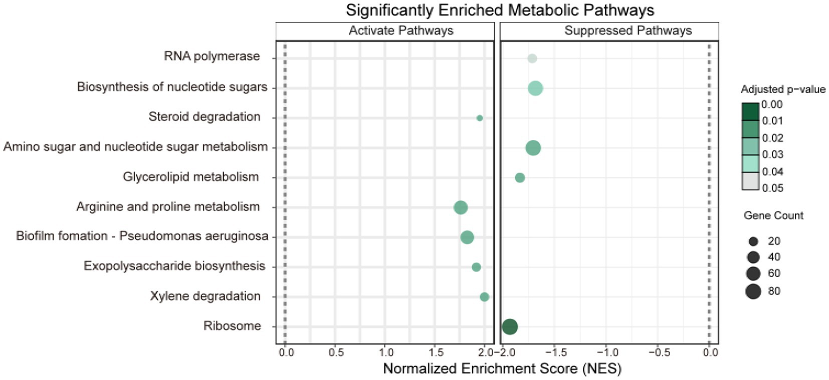 To elucidate broader biological trends and pathway alterations, Gene Set Enrichment Analysis (GSEA) was applied to all features across the two omics datasets (Figure 8). Ten significantly differentially expressed pathways (adjusted p-value < 0.05) were identified. Compared to PTL, the CJL treatment exhibited significant activation of: xylene degradation, exopolysaccharide biosynthesis, biofilm formation (Pseudomonas aeruginosa), arginine and proline metabolism, and steroid degradation. Conversely, pathways markedly suppressed in CJL included: ribosome, glycerolipid metabolism, amino sugar and nucleotide sugar metabolism, biosynthesis of nucleotide sugars, and RNA polymerase.