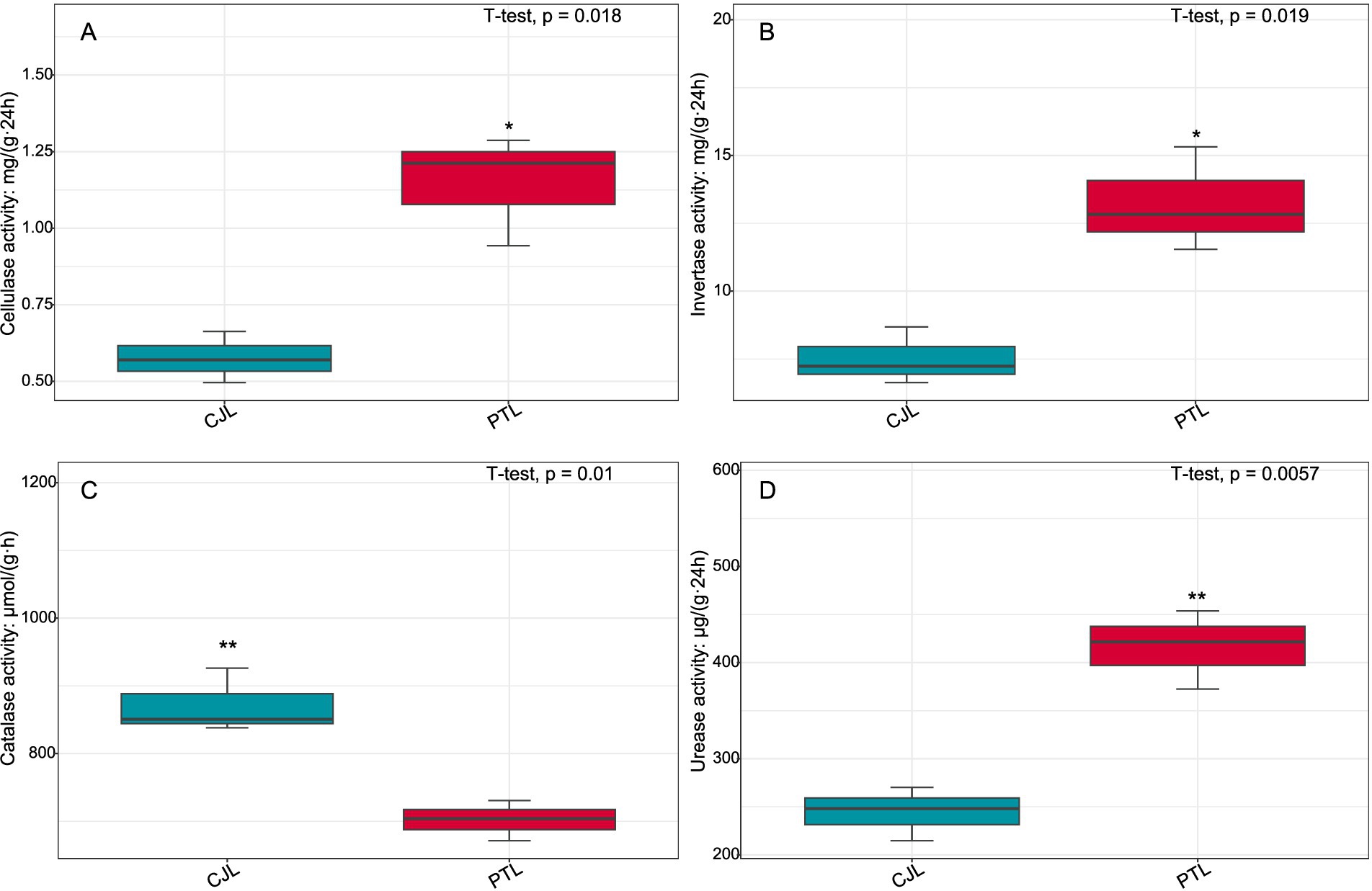 Cellulase activity was assayed by DNS method: 5.0 g fresh soil reacted with 1% carboxymethylcellulose sodium (CMC-Na) in acetate buffer (pH 5.0) at 50°C for 24 h; reactions were terminated with 3,5-dinitrosalicylic acid, and reducing sugars quantified at 540 nm (units: μmol glucose g−1 24 h−1). Invertase activity followed Hoffmann: 2.0 g soil incubated with 8% sucrose in phosphate buffer (pH 6.5) at 37 °C for 24 h, with glucose yield measured (units as above). Catalase activity used KMnO4 titration: 5.0 g soil reacted with 0.3% H2O2 at 25 °C for 20 min, and residual H2O2 titrated with 0.1 mol·L−1 KMnO4 (units: mL KMnO4 consumed g−1 20 min−1). Urease activity employed indophenol blue colorimetry: 5.0 g soil incubated with 10% urea in citrate buffer (pH 6.7) at 37 °C for 24 h, with NH4+-N production quantified (units: μg NH4+-N g−1 24 h−1). All enzymatic assays were performed in triplicate with substrate-free controls and standard curve calibration.