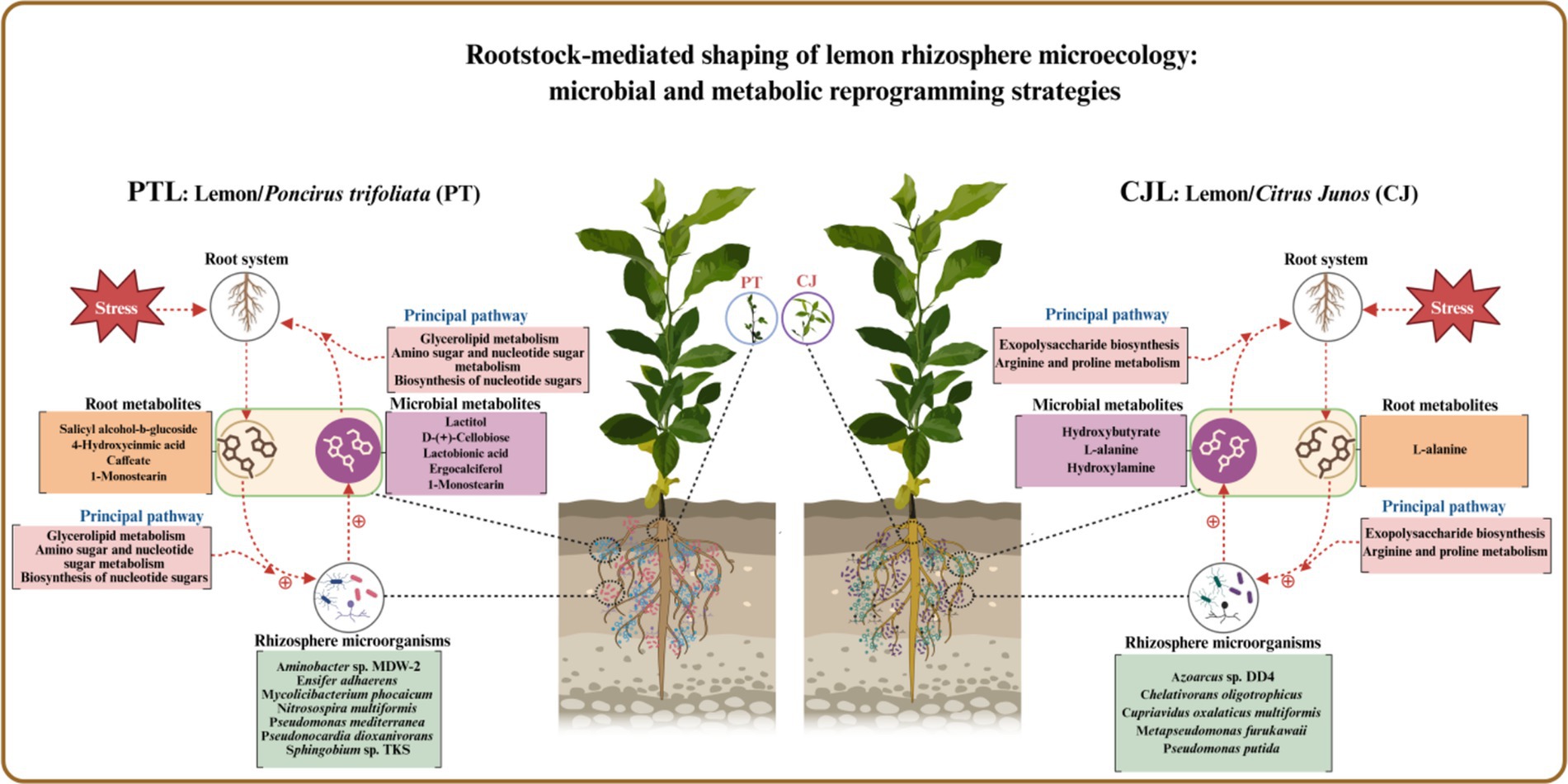 Lemon (Citrus limon) is a globally important economic fruit tree whose fruits contain abundant bioactive compounds including vitamin C, organic acids and flavonoids, with wide applications in food, pharmaceutical and cosmetic industries. In commercial production, grafted lemon trees predominate, with rootstocks significantly influencing fruit quality, yield, as well as tree adaptability and stress resistance (Goldschmidt, 2014). However, sustainable lemon production faces major challenges including soil sickness, soil-borne diseases and inefficient nutrient utilization. Conventional cultivation relying on chemical fertilizers and pesticides not only increases costs but also exacerbates soil acidification, reduces microbial diversity and degrades ecosystem services (Nair and Ngouajio, 2012). Consequently, green production models based on rhizosphere microecological regulation have emerged as a research focus. As the critical interface mediating interactions between the scion and the soil environment, the regulatory potential of rootstocks over rhizosphere microbial communities and metabolites is garnering increasing attention (Liu et al., 2018; Wang et al., 2014; Ruan et al., 2020). Grafting creates a novel rootstock-scion composite whose root characteristics are rootstock-determined (Goldschmidt, 2014). Plants reshape their rhizosphere through root architecture (RellánÁlvarez et al., 2016; Ragland et al., 2024), exudate composition (Mommer et al., 2016) and stress signaling (Tan et al., 2024), influencing microbial colonization and functionality (Shi et al., 2025; Ragland et al., 2024), thereby regulating nutrient uptake, disease resistance and stress tolerance (Hodge et al., 2009). For instance, studies demonstrate that wild soybean under salt stress recruits Pseudomonas bacteria via root-secreted purine metabolites like xanthine, mitigating salt-induced growth inhibition (Zheng et al., 2024). Similarly, maize root exudates attract Bacillus amyloliquefaciens OR2-30, which inhibits conidial formation and germination in Fusarium graminearum, induces reactive oxygen species (ROS) production, and triggers hyphal cell death (Xie et al., 2022). In potato monoculture systems, root secretion of nobiletin recruits Pantoea sp. MCC16, a high auxin (IAA)-producing strain, restoring root functional traits and alleviating replant disease to enhance yield (Ma et al., 2025). Furthermore, ginger (Zingiber officinale) root exudates, including compounds like sinapyl alcohol and 6-gingerol, significantly enhance the colonization and proliferation of Burkholderia species in the chrysanthemum (Chrysanthemum morifolium) rhizosphere, strengthening suppression against Fusarium wilt (Zhu et al., 2025).