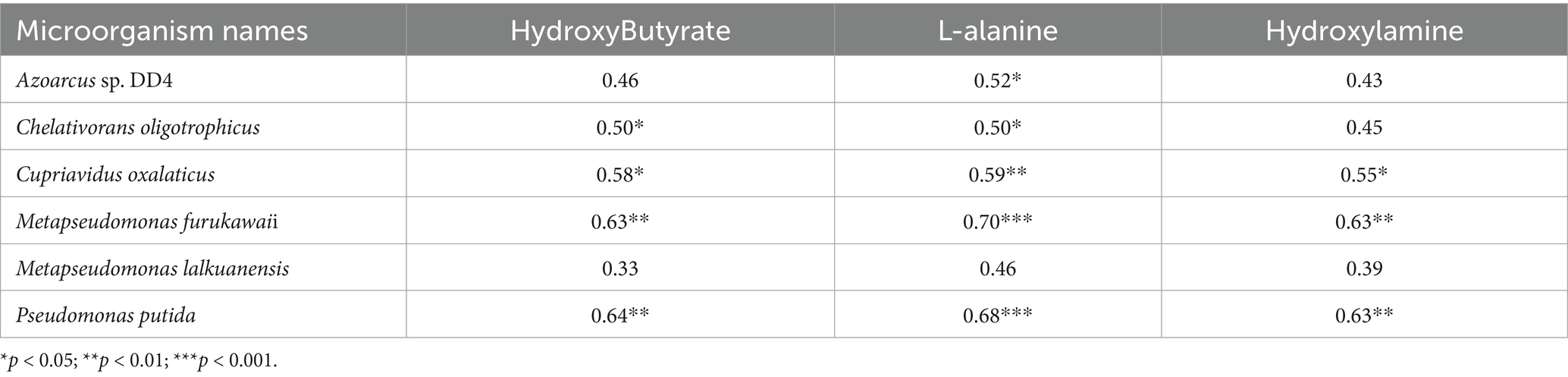 This study analyzed correlated microbial taxa and metabolites, focusing on the top 20 most strongly associated pairs. Dominant microbial clades included Actinomycetes, Alphaproteobacteria, Betaproteobacteria, and Gammaproteobacteria, while primary metabolites comprised amino acids, organic acids/derivatives, fatty acids, and sugars. Correlation analyses revealed that five metabolites—salicyl alcohol-β-glucoside, 4-hydroxycinnamic acid, caffeate, benzene-1,4-dicarboxylic acid (a microbial degradation intermediate of anthropogenic pollutants), and alizarin (predominantly sugar/organic acid derivatives originating from roots)—exhibited significant synergism with 11 rhizobacterial species affiliated with Actinomycetota, Pseudomonadota, and Thermoproteota. This aligns with Bharti et al. (2016), demonstrating root-exuded sugars/organic acids facilitate soil microbial carbon cycling and growth promotion. Conversely, these five metabolites strongly antagonized the EDTA-degrading bacterium BNC1, a Gram-negative strain utilizing EDTA as its sole C/N source; competitive niche exclusion by sugar-stimulated actinobacterial proliferation may drive this suppression (Trivedi et al., 2020; Nortemann, 1992). In contrast, the remaining 15 metabolites—primarily microbial-derived, with minor root/exogenous contributions (e.g., methionine-13CD3, a synthetic residue)—showed inverted effects: antagonism toward the aforementioned 11 rhizobacteria, potentially mediated by bacterial interference (e.g., quorum sensing quenching; Trivedi et al., 2020) or dual-regulatory compounds like benzoate derivatives (Meng et al., 2023), while synergistically promoting BNC1. This BNC1-specific enhancement may arise from its selective substrate utilization (e.g., vitamin stimulation by biotin/folate; Nortemann, 1992), though its soil metabolic traits remain poorly characterized.