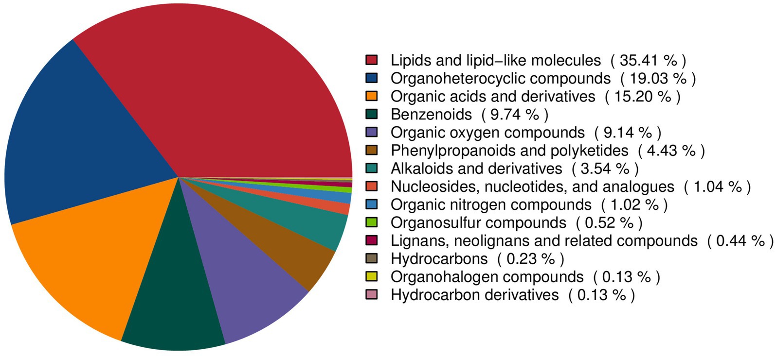 Pie chart displaying the distribution of chemical compound categories. Lipids and lipid-like molecules constitute 35.41%; organoheterocyclic compounds 19.03%; organic acids 15.20%; benzenoids 9.74%; organic oxygen compounds 9.14%; and others include phenylpropanoids, alkaloids, nucleosides, organic nitrogen, organosulfur, lignans, hydrocarbons, organohalogen compounds, and hydrocarbon derivatives with smaller percentages.