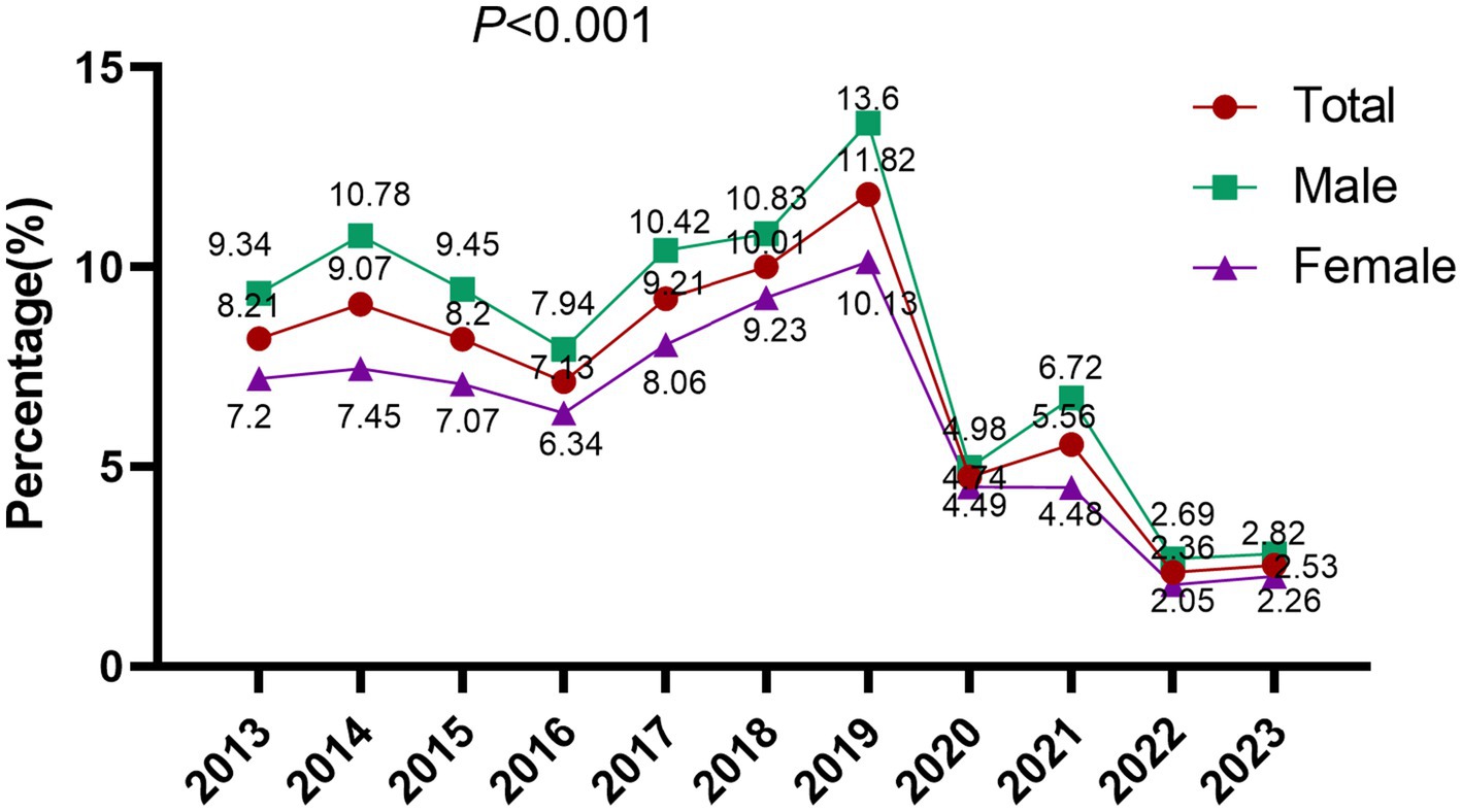 The overall EBV DNA positive rate across the study period was 6.77% (5,154/76,135). Annual stratification revealed marked temporal variation, with positive rates fluctuating between 2.36 and 11.82%: 8.21% (284/3,458) in 2013, 9.07% (426/4,695) in 2014, 8.20% (501/6,109) in 2015, 7.13% (447/6,272) in 2016, 9.21% (651/7,067) in 2017, 10.01% (759/7,579) in 2018, 11.82% (920/7,785) in 2019, followed by a marked decline to 4.74% (238/5,025) in 2020, 5.56% (424/7,627) in 2021, 2.36% (209/8,866) in 2022, and 2.53% (295/11,652) in 2023. The difference between the groups was statistically significant (p < 0.001). The period from 2017 to 2019 was defined as the pre-COVID-19 era, while 2020 to 2022 was designated as the COVID-19 pandemic period for comparative analysis (Wang et al., 2023). The EBV DNA positivity rate during the COVID-19 pandemic period (2020–2022) was markedly reduced at 4.05% (871/21,518), compared to 10.39% (2,330/22,431) in the pre-COVID-19 period (2017–2019), with the difference reaching high statistical significance (p < 0.001), indicating a substantial decline in EBV detection following the onset of the pandemic (Figure 1).