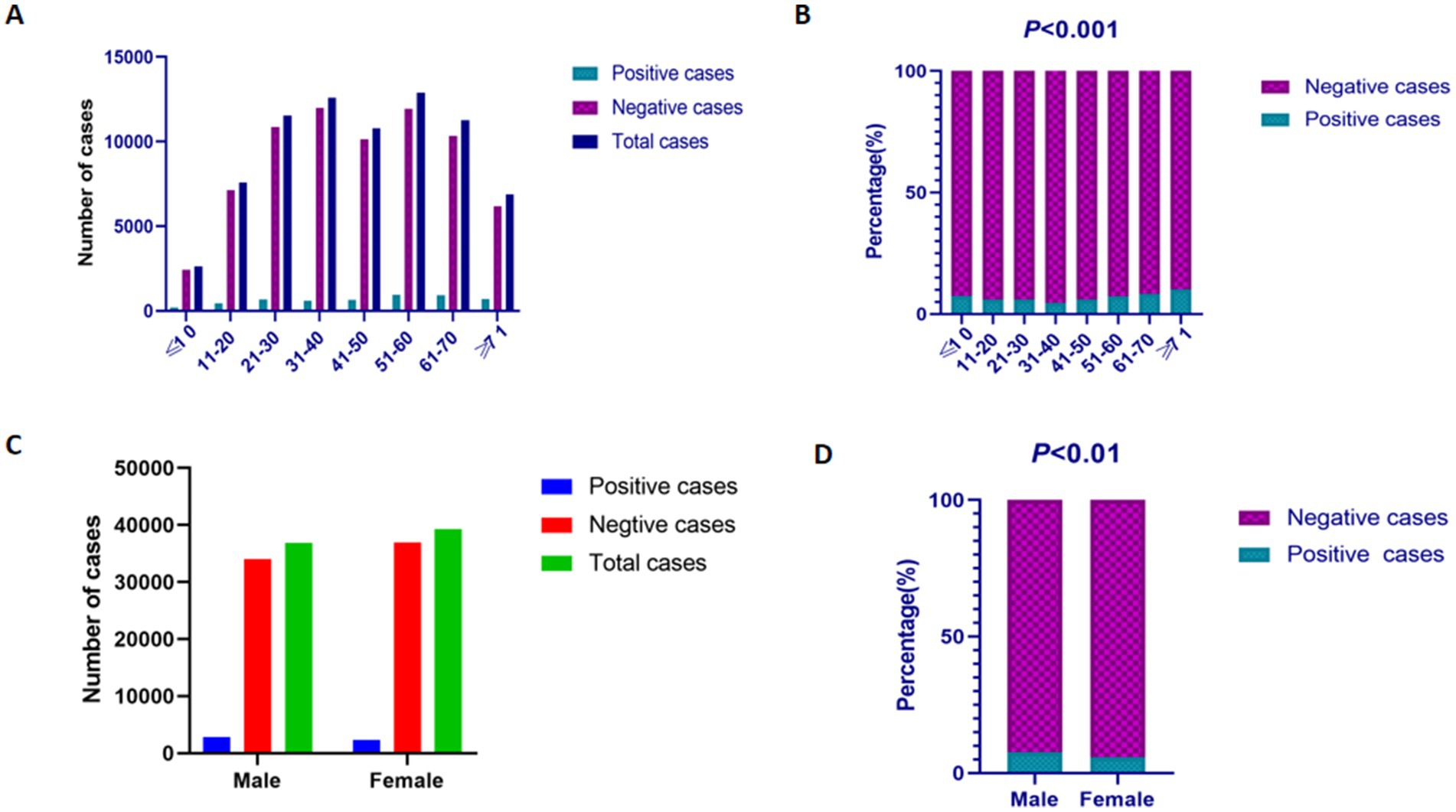 Figure 2. The prevalence of EBV DNA in different gender and age groups. (A) The results of EBV DNA testing in different age groups. (B) The positive rates of EBV DNA testing in different age groups. (C) The results of EBV DNA testing in male and female patients. (D) The positive rates of EBV DNA testing in male and female patients.