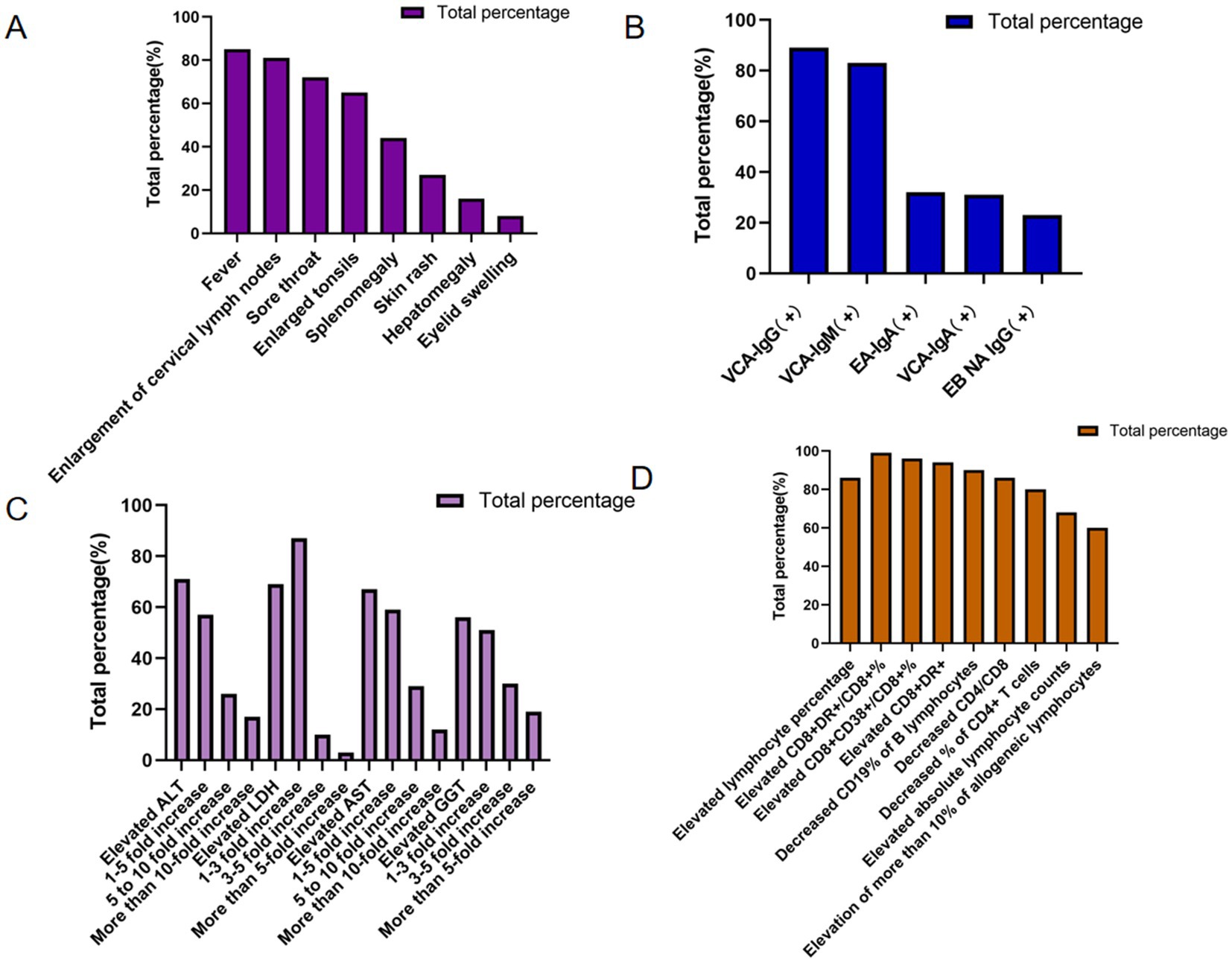 Figure 3. Percentage of clinical data for IM patients. (A) Clinical symptoms of IM patients. (B) EBV antibody among IM patients. (C) Liver function of IM patients. (D) Lymphocyte features of IM patients.