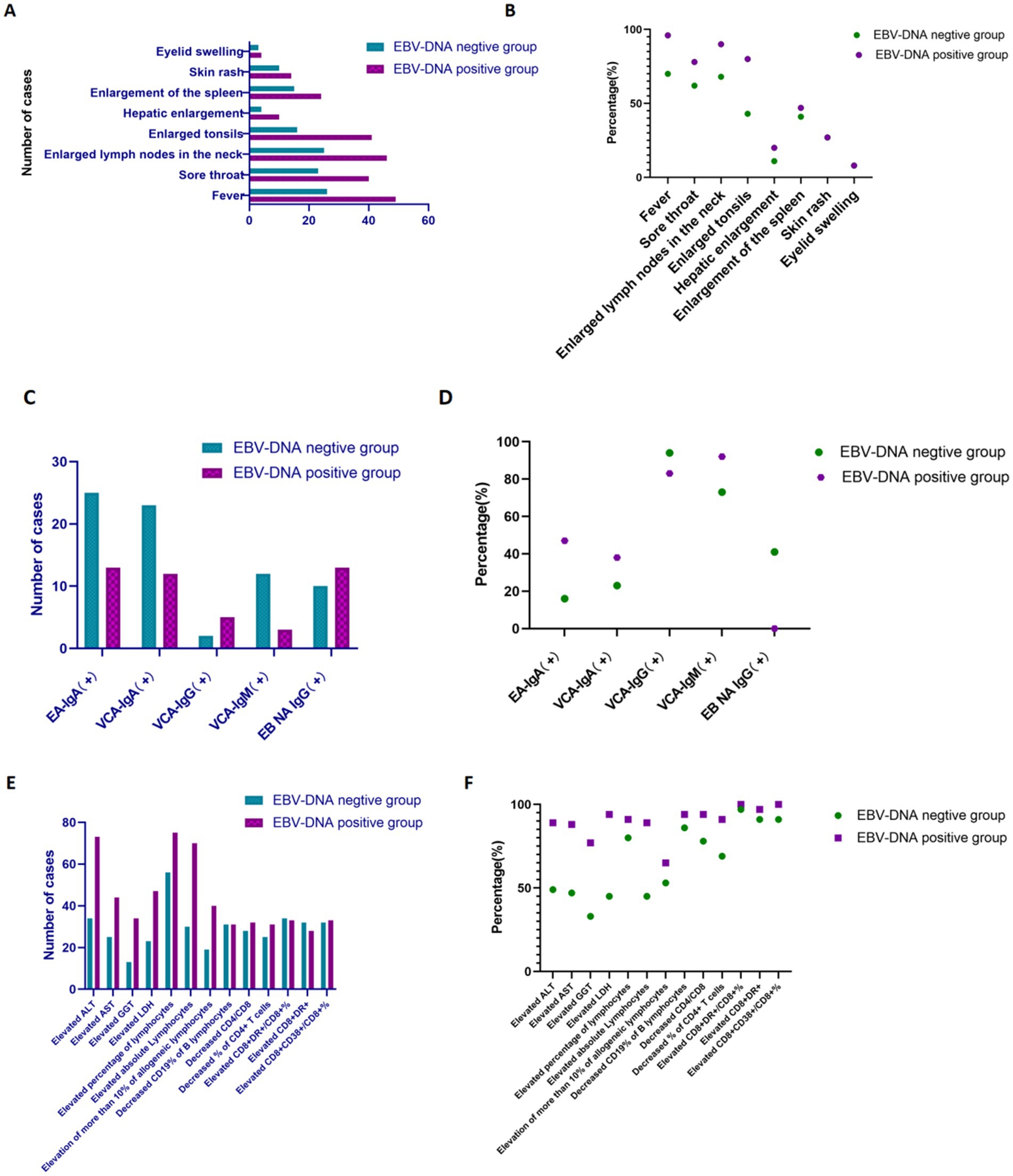 Figure 4. The comparison of various indicators with IM patients between EBV DNA-positive and EBV DNA-negative groups. (A,B) Clinical manifestations of IM patients in subgroups. (C,D) EBV antibodies among IM patients in subgroups. (E,F) Liver function and lymphocyte features of IM patients in subgroups.