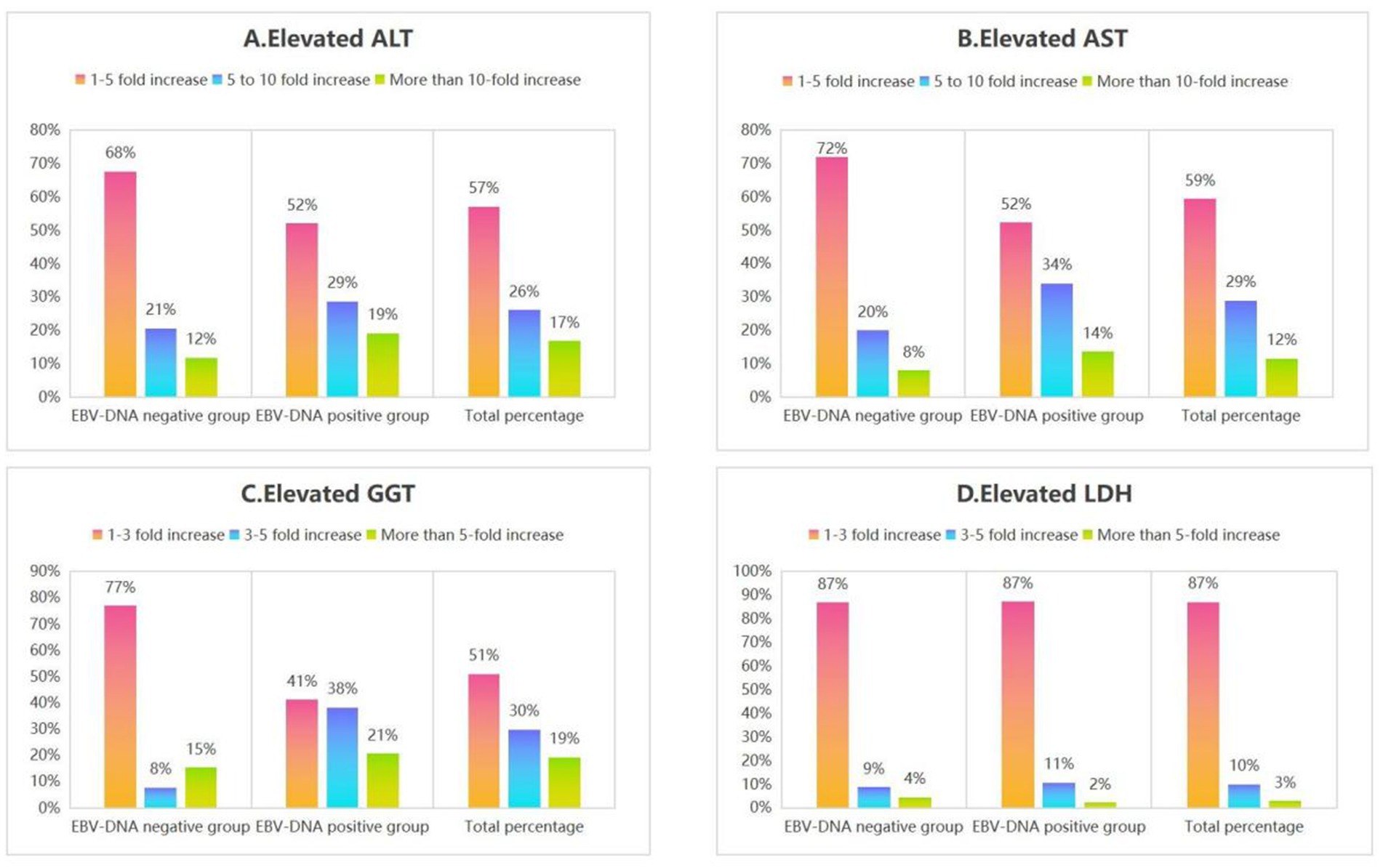 Additionally, among the included patients with IM, the 1 to 5-fold elevations in ALT and AST were the most prevalent pattern in both the EBV DNA-positive and EBV DNA-negative groups. Similarly, 1 to 3-fold elevations in GGT and LDH were the predominant findings across both subgroups (Figure 5), as demonstrated in Section 4.3, acute EBV infection may be associated with a certain degree of hepatic dysfunction. This finding suggests that there is likely no significant correlation between EBV-induced hepatic injury and EBV DNA levels.